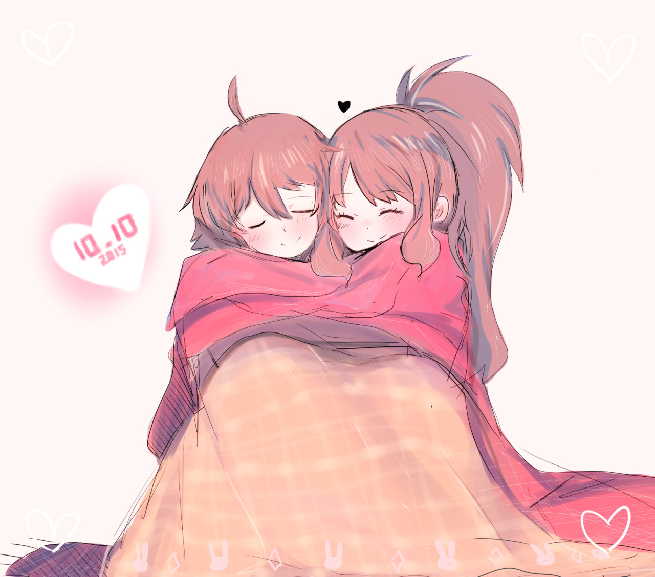1boy 1girl ahoge anonkyun antenna_hair blush brown_hair closed_eyes dated heart hetero hilbert_(pokemon) hilda_(pokemon) nintendo pokemon pokemon_black_and_white ponytail shared_blanket smile under_covers