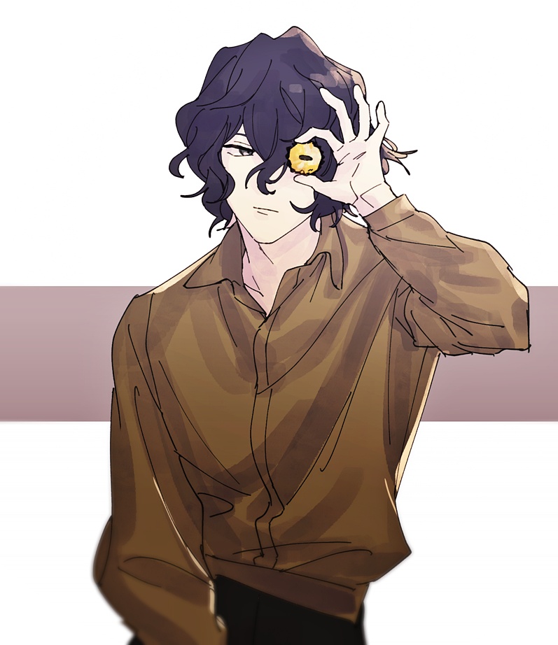 1boy 404_(m0111652) black_eyes black_hair black_pants brown_shirt closed_mouth coin collared_shirt commentary_request cowboy_shot hair_between_eyes holding holding_coin male_focus pants saibou_shinkyoku shirt short_hair solo utsugi_noriyuki wavy_hair