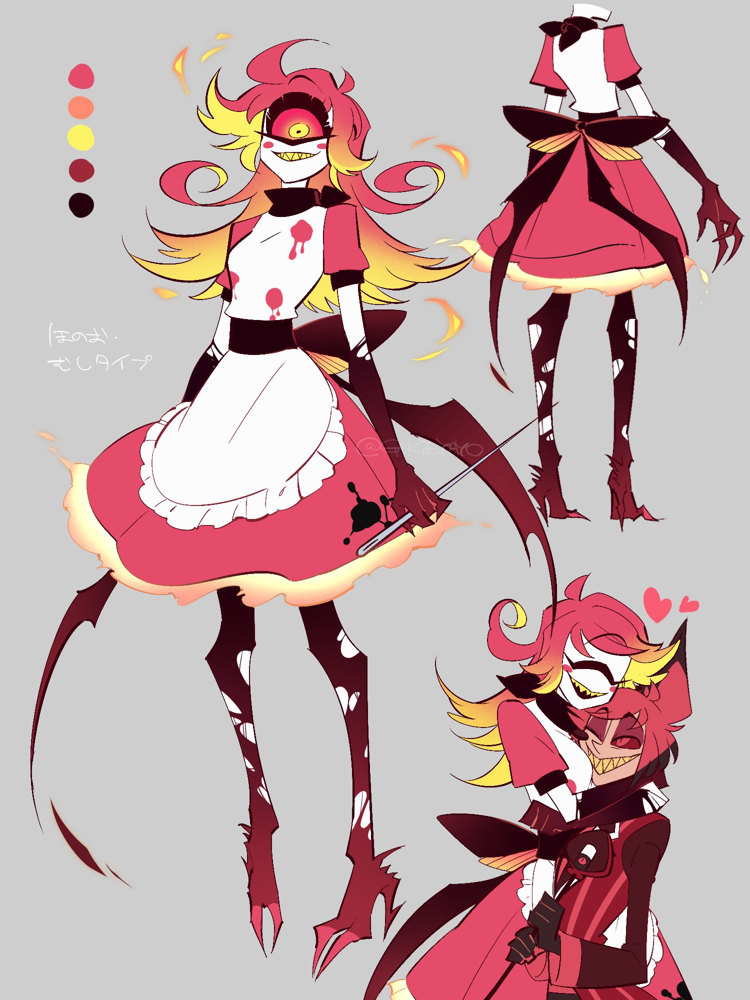 1boy 1girl aged_up alastor_(hazbin_hotel) black_hair closed_eyes collage color_guide commentary_request demon_girl dress formal_clothes grin hazbin_hotel hellaverse highres holding_sewing_needle kidya_pipopi long_hair looking_at_viewer multicolored_hair niffty_(hazbin_hotel) one-eyed pantyhose red_hair sharp_teeth short_hair smile suit teeth torn_clothes torn_pantyhose