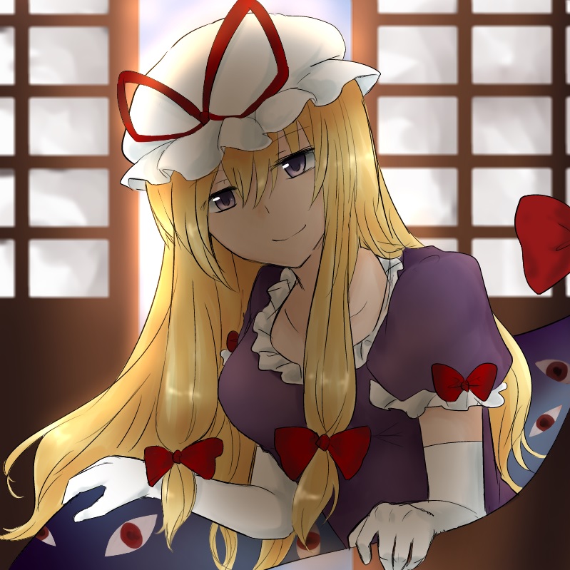 1girl blonde_hair bow closed_mouth commentary_request dress elbow_gloves gap_(touhou) gloves hair_bow hat hat_ribbon koto_(shiberia39) long_hair looking_at_viewer mob_cap purple_dress purple_eyes red_bow red_ribbon ribbon shouji sleeve_bow sliding_doors smile solo touhou white_gloves white_hat yakumo_yukari