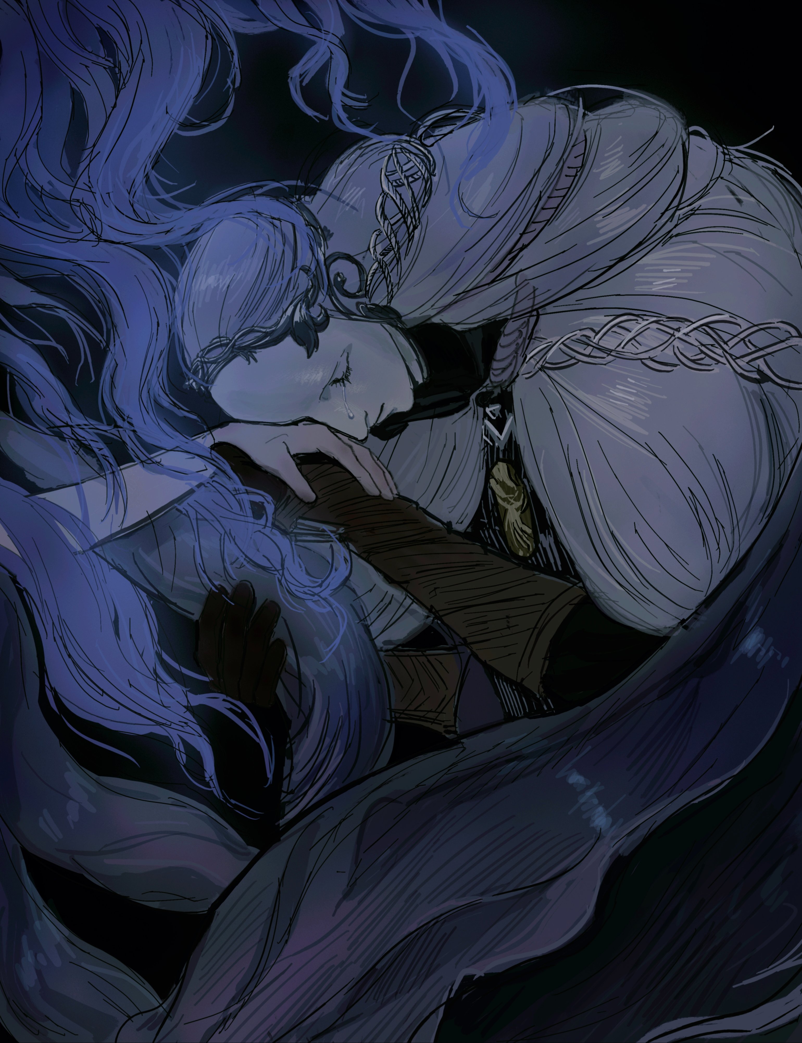 1boy 1girl absurdres black_background black_gloves cloak elbow_gloves elden_ring elden_ring:_shadow_of_the_erdtree gloves hand_up hands_up highres hlinwngnnm79651 holding_hands long_hair long_sleeves mask profile purple_hair single_tear solo_focus st._trina_(elden_ring) thiollier_(elden_ring) white_cloak