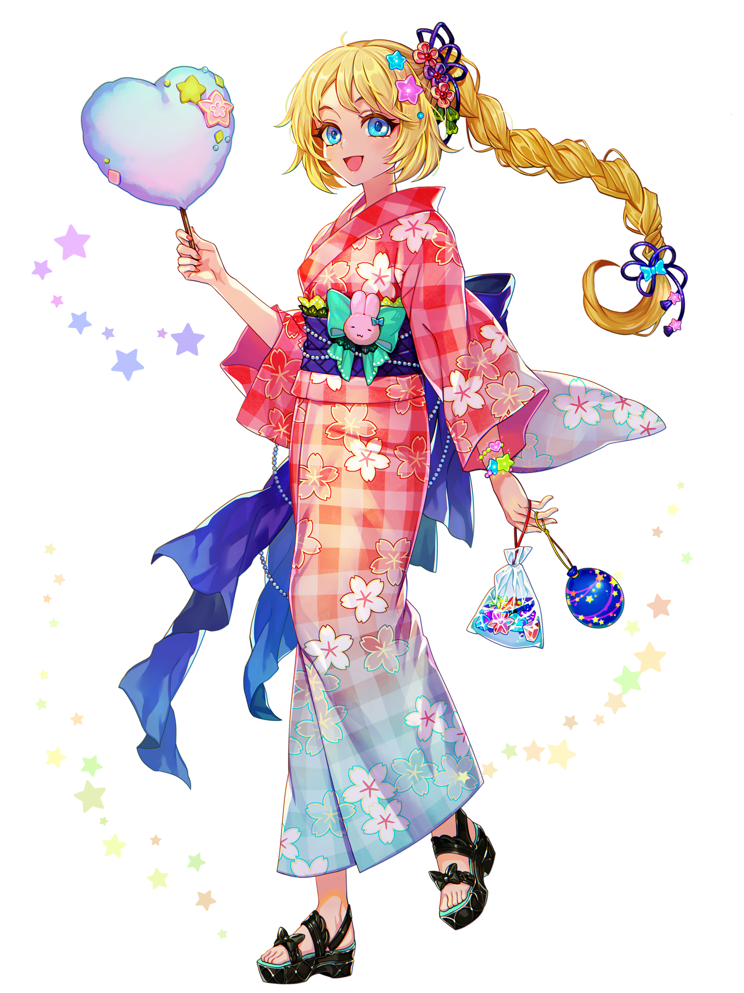 1girl blonde_hair blue_eyes braid cotton_candy dairoku_ryouhei floral_print floral_print_kimono flower food full_body gradient_clothes gradient_kimono hachi_(tw) hair_flower hair_ornament highres holding holding_cotton_candy holding_food japanese_clothes kimono koisuru_suzurism long_hair low-tied_long_hair obi pink_kimono print_kimono ribbon sandals sash solo standing star_(symbol) star_hair_ornament transparent_background very_long_hair water_yoyo white_background