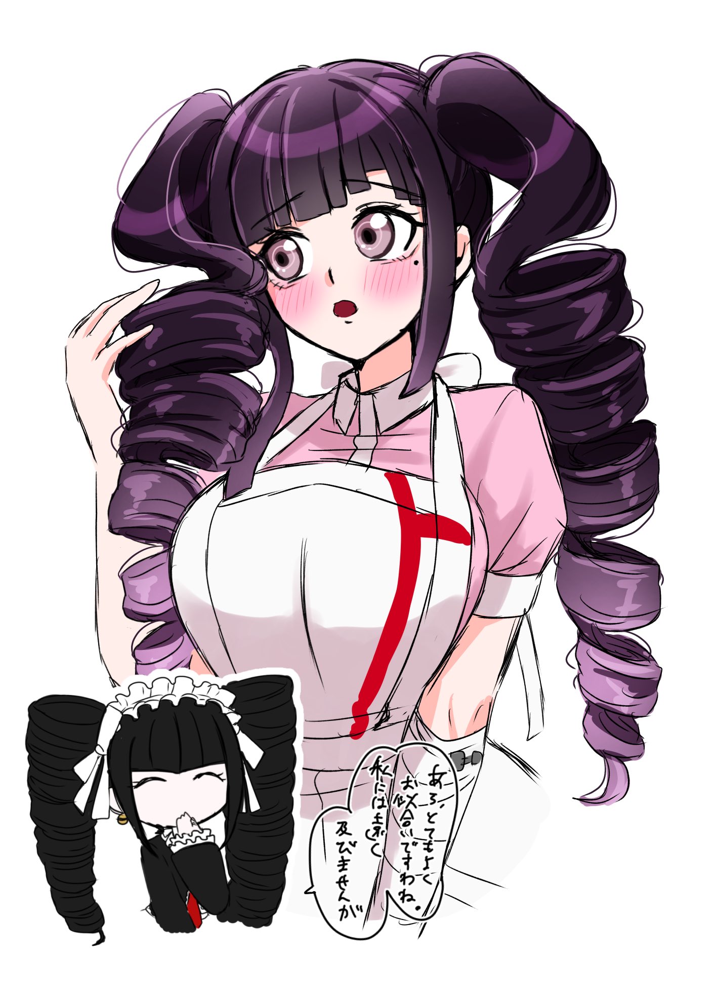 2girls alternate_hairstyle apron bandaged_arm bandages black_hair blush breasts celestia_ludenberg collared_shirt cropped_torso danganronpa:_trigger_happy_havoc danganronpa_(series) danganronpa_2:_goodbye_despair drill_hair hand_up headdress highres large_breasts mole mole_under_eye mozuku_(iiiiiiimomo) multicolored_hair multiple_girls pink_eyes pink_hair pink_shirt puffy_short_sleeves puffy_sleeves shirt short_sleeves smile solo_focus speech_bubble translation_request tsumiki_mikan twin_drills twintails two-tone_hair two-tone_shirt white_apron
