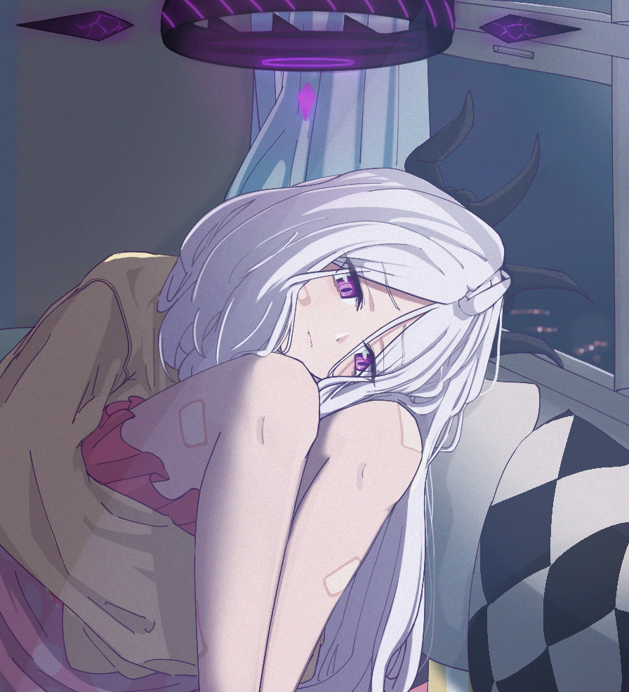 1girl 3: ahoge bandaid bandaid_on_cheek bandaid_on_face bandaid_on_knee bandaid_on_leg blue_archive blurry building cardigan commentary_request couch demon_girl demon_horns depth_of_field hair_between_eyes hair_down halo head_tilt hina_(blue_archive) hina_(pajamas)_(blue_archive) horns hugging_own_legs indoors knees_to_chest long_hair long_sleeves looking_at_viewer night official_alternate_costume official_alternate_hairstyle omoti_tumaru on_couch pajamas pink_pajamas polka_dot polka_dot_pajamas purple_eyes sidelocks sitting sky skyscraper solo wavy_hair white_hair window yellow_cardigan