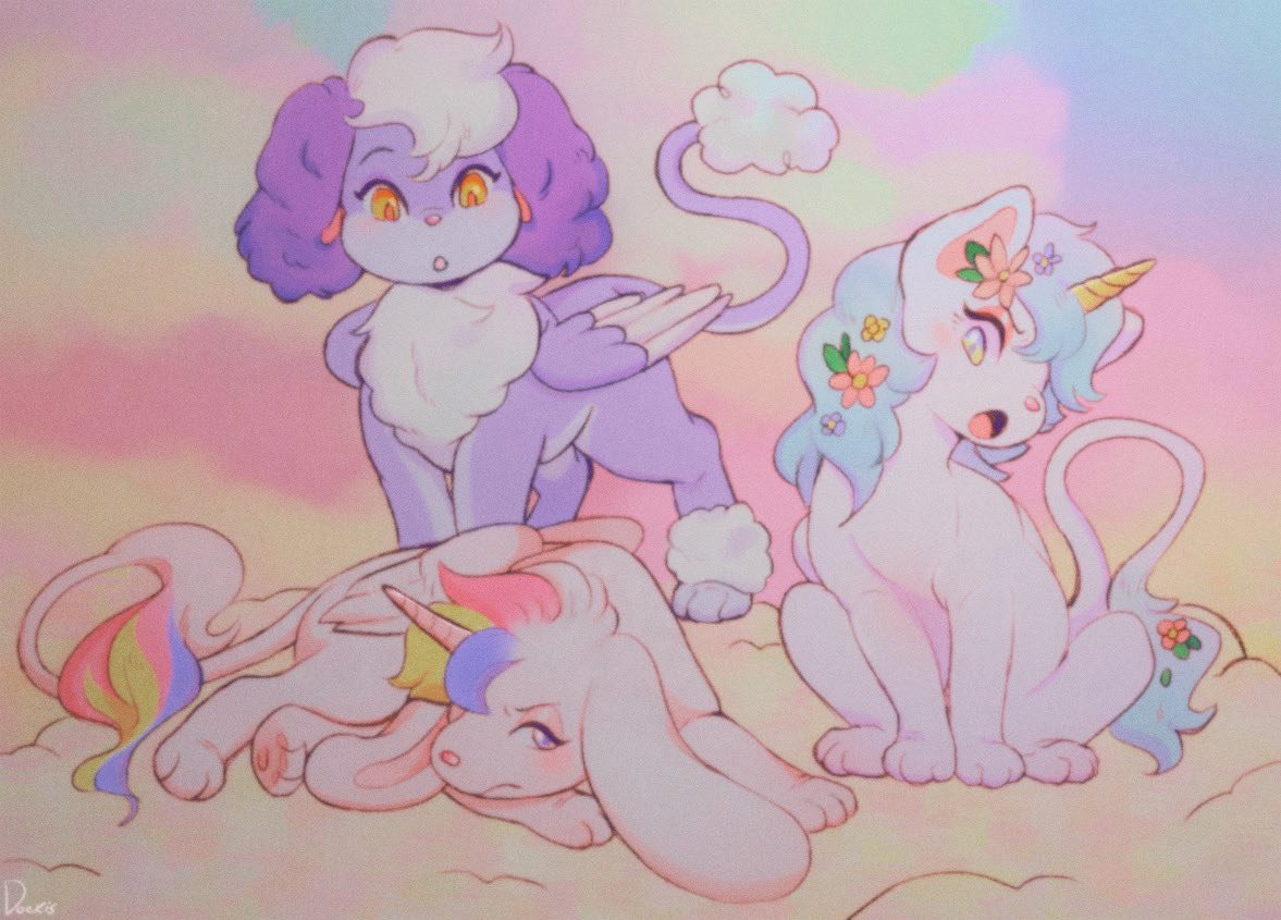 :o animal_focus blue_hair blush cloud colorful commentary creature creature_focus doekis dove_(doekis) english_commentary flower hair_flower hair_ornament horns long_hair lying mane multicolored_hair no_humans open_mouth original purple_eyes purple_fur short_hair signature single_horn sitting tail white_fur wings yellow_eyes yume_kawaii