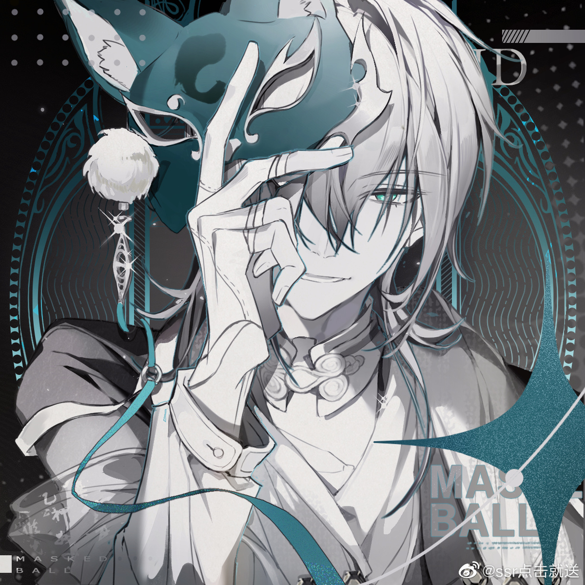 1boy alkaid_mcgrath alkaid_mcgrath_(masquerade) aqua_theme black_background character_name covering_one_eye domino_mask dress_shirt eye_mask fox_mask gloves green_eyes greyscale hair_between_eyes half_gloves hand_up highres holding holding_mask jacket long_sleeves looking_at_viewer lovebrush_chronicles male_focus mask medium_hair monochrome official_alternate_costume official_art parted_lips partially_fingerless_gloves pom_pom_(clothes) scarf see-through_clothes see-through_shawl shawl shirt smile solo spot_color ssr_dianji_jiu_song upper_body