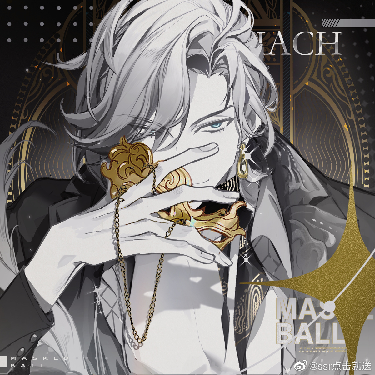 1boy aqua_eyes black_background character_name closed_mouth collared_shirt curtained_hair domino_mask earrings english_text eye_mask eyes_visible_through_hair feathers floating_earrings glint gold_earrings greyscale hand_up highres holding holding_mask jacket jacket_on_shoulders jewelry lars_rorschach lars_rorschach_(masquerade) long_sleeves looking_at_viewer lovebrush_chronicles male_focus mask masquerade_mask monochrome official_alternate_costume official_art open_clothes open_shirt scarf shirt short_hair smile solo sparkle spot_color ssr_dianji_jiu_song swept_bangs upper_body upturned_eyes