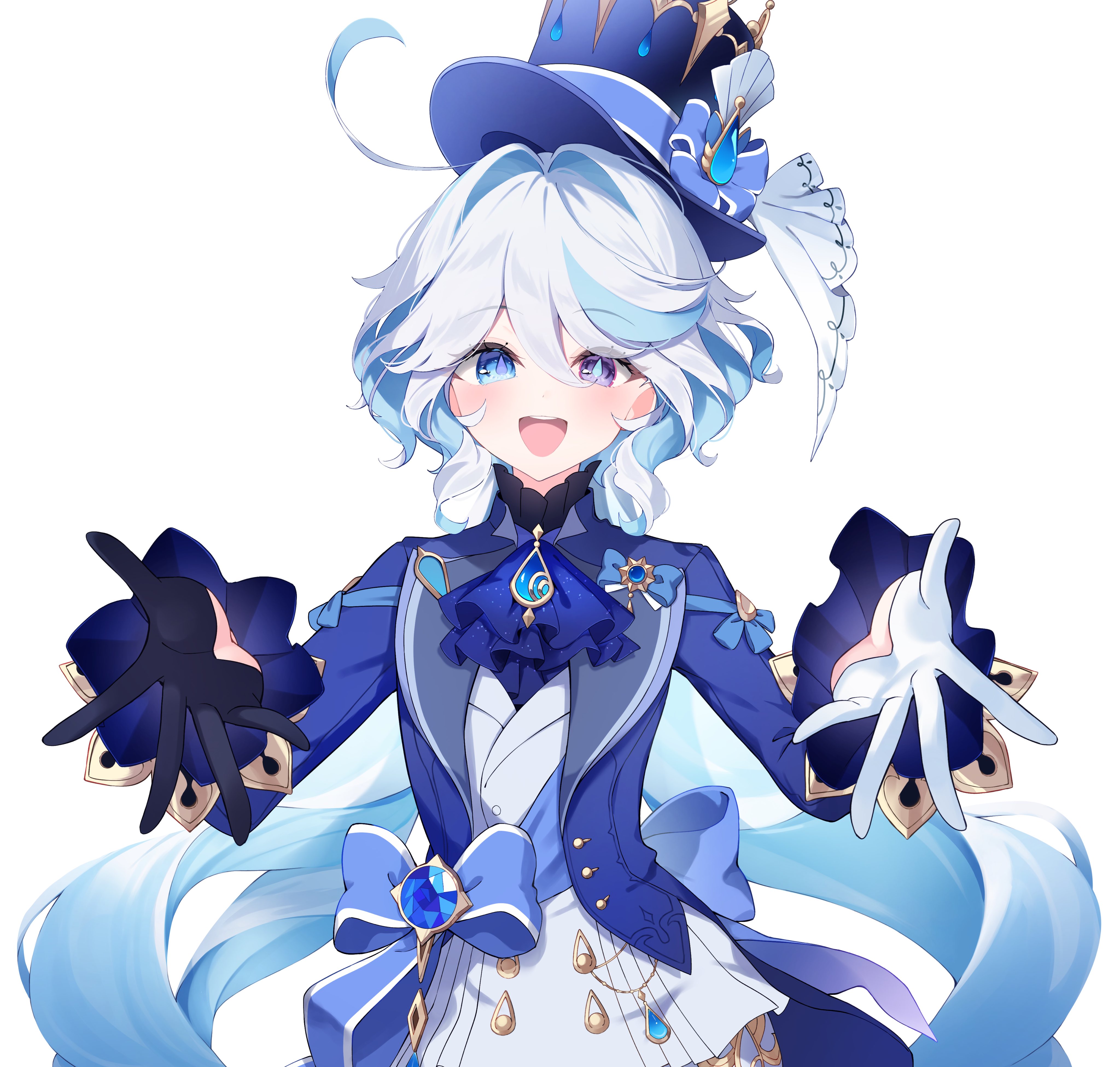 1girl :d absurdres ahoge ascot asymmetrical_gloves black_gloves blue_ascot blue_bow blue_eyes blue_gem blue_hair blue_hat blue_jacket bow commentary drop-shaped_pupils furina_(genshin_impact) gem genshin_impact gloves hair_between_eyes hat hat_bow heterochromia highres jacket ouji_fashion light_blue_hair light_blush lolita_fashion long_hair long_sleeves looking_at_viewer mismatched_gloves multicolored_hair open_mouth outstretched_arms pomepome1207 simple_bird smile solo streaked_hair symbol-shaped_pupils teeth top_hat upper_body upper_teeth_only very_long_hair white_background white_gloves white_hair