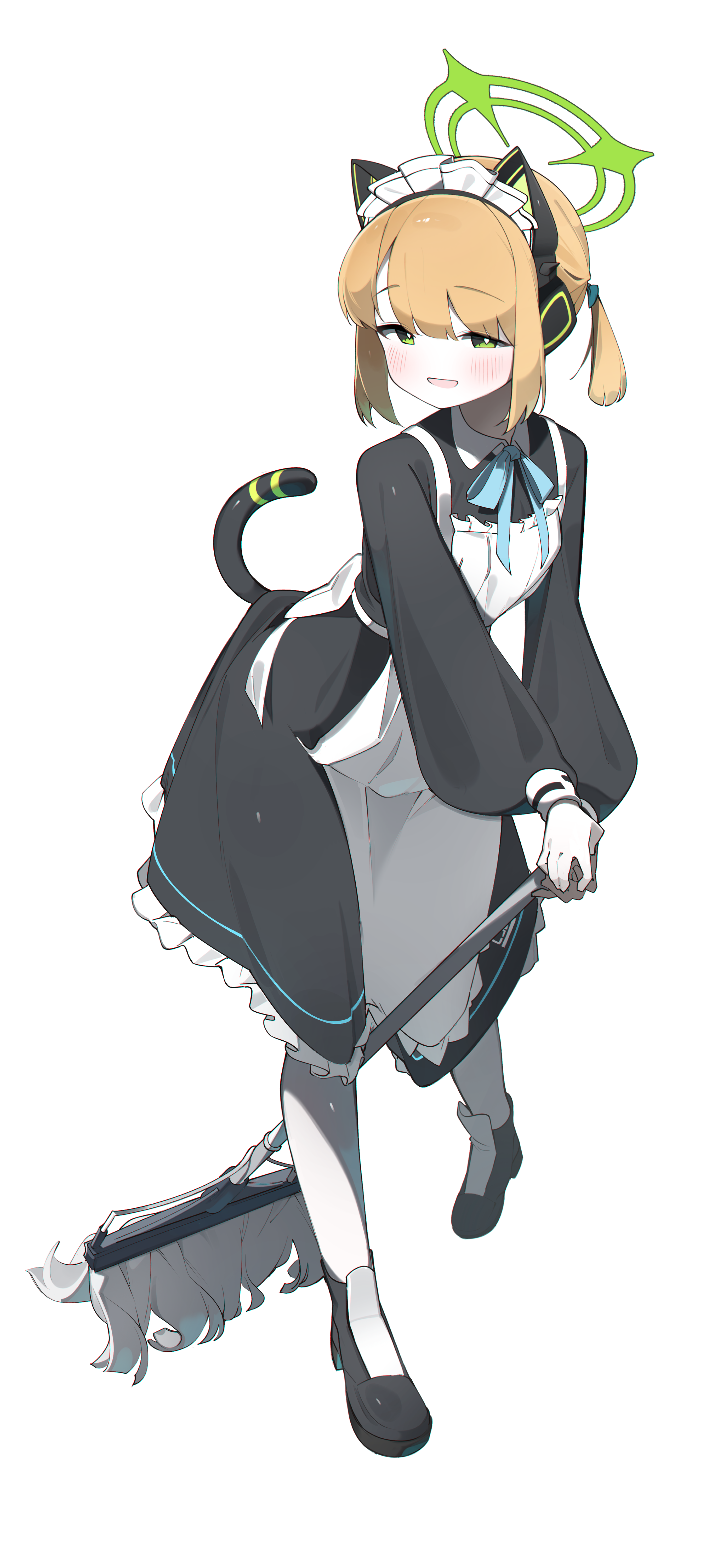 1girl absurdres animal_ear_headphones animal_ears apron black_footwear blonde_hair blue_archive blush broom bullet_(bullet0701) cat_ear_headphones cat_ears cat_tail game_development_department_(blue_archive) green_eyes green_halo halo headphones highres holding looking_at_viewer maid maid_apron maid_headdress medium_hair midori_(blue_archive) open_mouth simple_background solo standing tail white_background