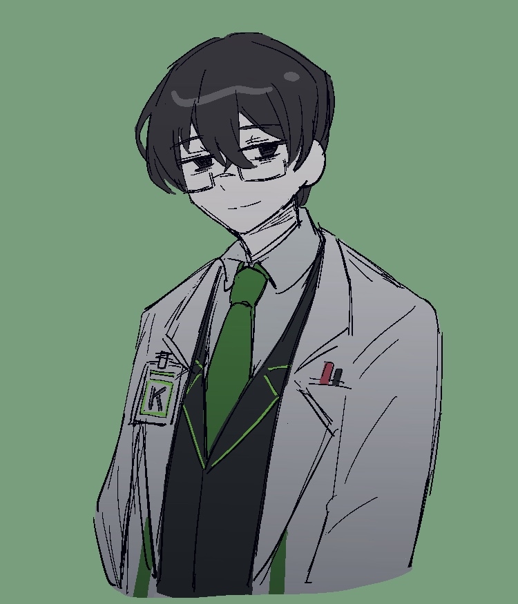 1boy black_eyes black_hair black_jacket closed_mouth glasses green_background green_necktie inoriyuki jacket k_corp._(identity)_(project_moon) lab_coat limbus_company looking_at_viewer necktie project_moon simple_background smile wing_collar yi_sang_(project_moon)