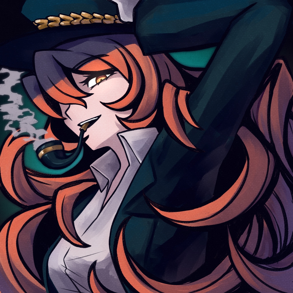1girl arm_up collared_shirt green_hat green_jacket hat inoriyuki ishmael_(project_moon) jacket limbus_company long_hair long_sleeves looking_at_viewer open_mouth orange_hair pequod_(identity)_(project_moon) project_moon shirt sidelocks smile smoking_pipe solo very_long_hair white_shirt