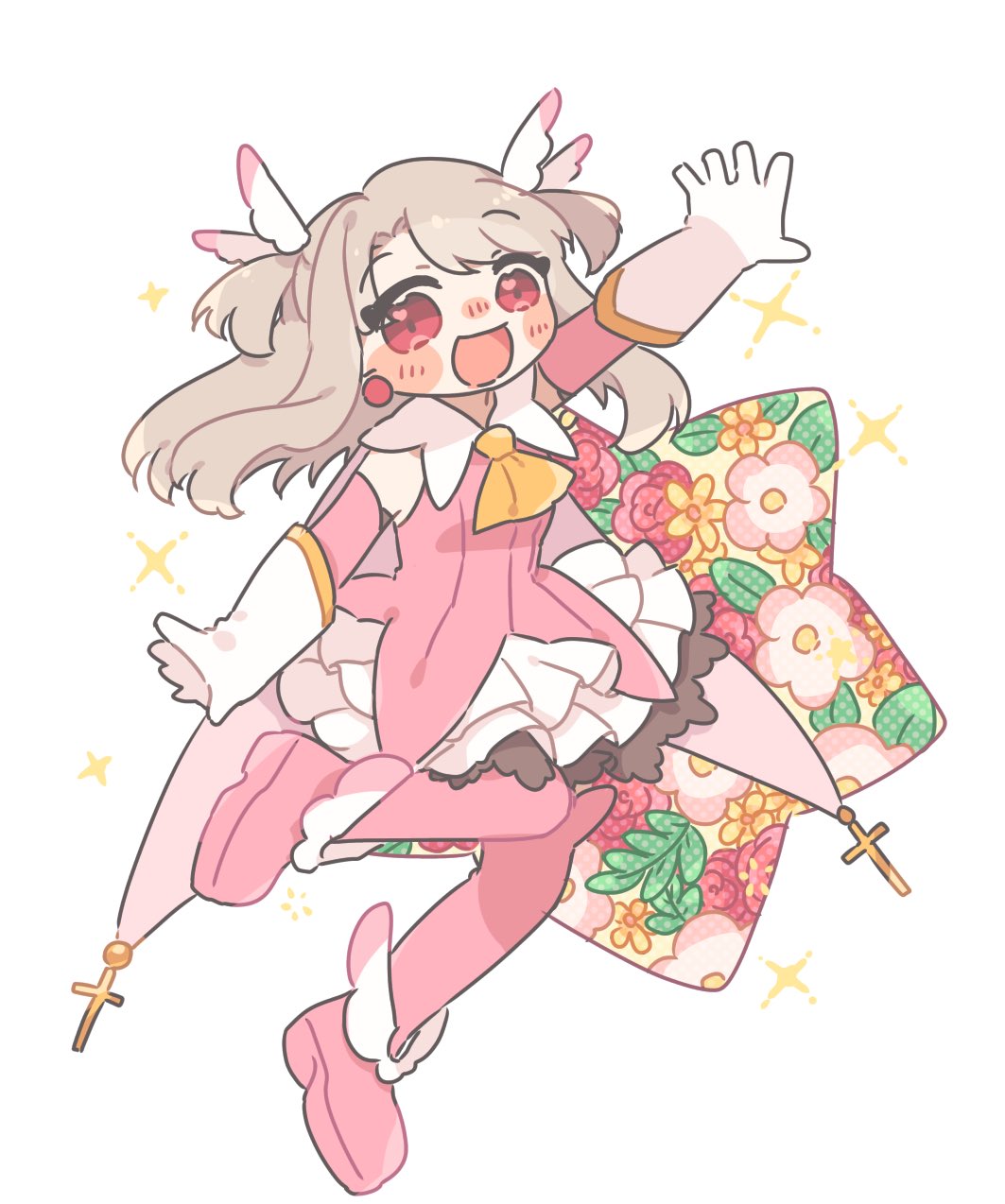 1girl anko_omotimoti blush boots dress fate/kaleid_liner_prisma_illya fate_(series) full_body gloves grey_hair highres illyasviel_von_einzbern long_hair looking_at_viewer magical_girl open_mouth pink_boots pink_dress prisma_illya red_eyes smile solo sparkle two_side_up