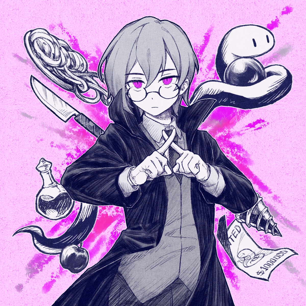 1boy apple character_request collared_shirt crossed_fingers food fruit glasses greyscale_with_colored_background hebi_no_inochi highres inoriyuki knife looking_at_viewer necktie pants poster_(object) purple_background purple_eyes shirt simple_background snake solo spot_color staff vest wanted_poster
