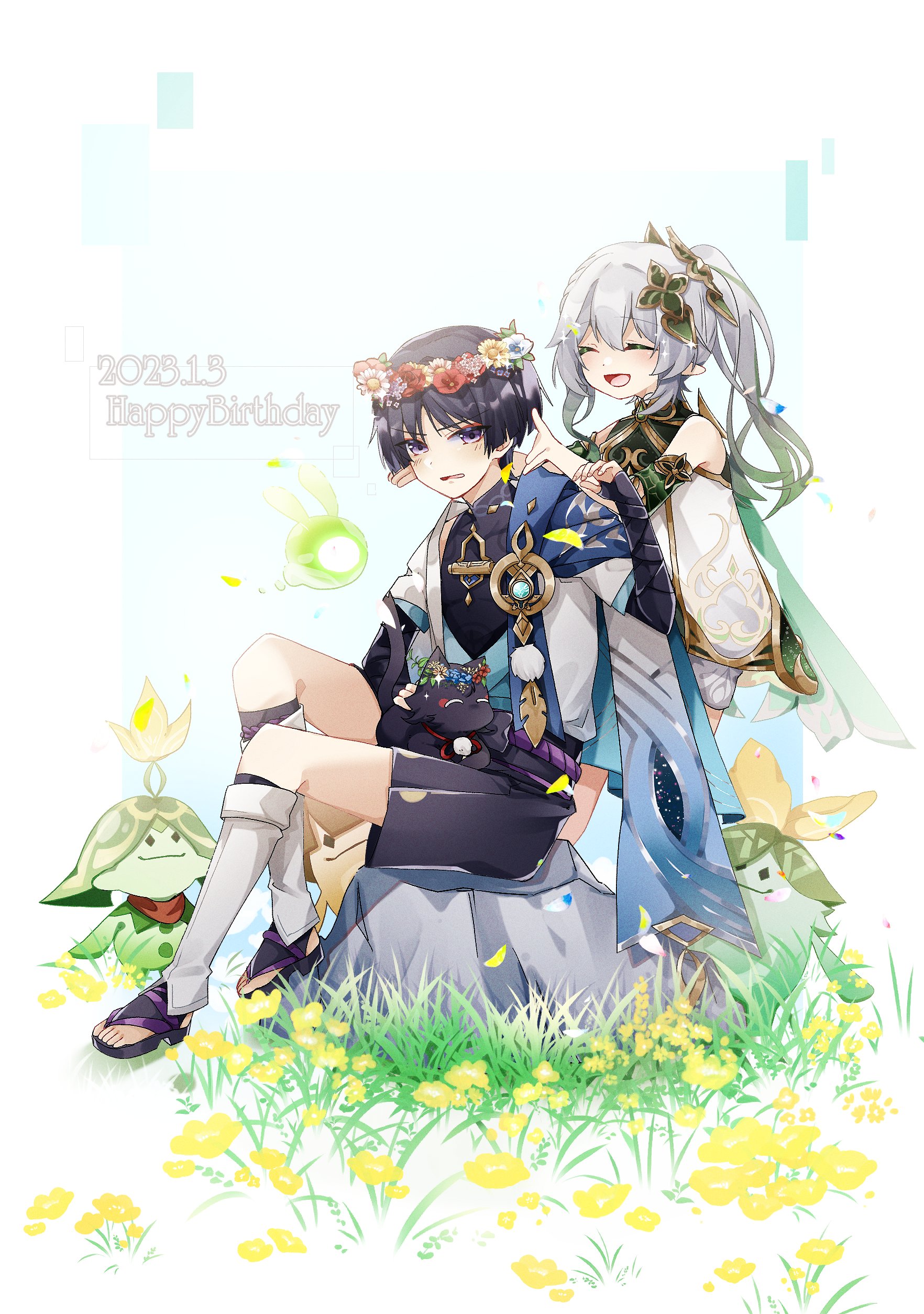 1boy 1girl :d absurdres animal animal_on_lap aranara_(genshin_impact) black_bow black_footwear black_hair black_sash black_shirt black_shorts bloomers blue_background blue_cape blue_flower blunt_ends blush bow braid bridal_gauntlets cape cat cat_on_lap closed_eyes commentary_request dated detached_sleeves dress eyeshadow falling_petals flower flower_wreath genshin_impact gold_trim gradient_hair grass green_dress green_hair green_sleeves hair_between_eyes hair_ornament hand_up happy_birthday head_wreath highres jacket long_hair makeup multicolored_hair nahida_(genshin_impact) on_lap on_rock open_clothes open_jacket open_mouth petals pink_flower pointy_ears pom_pom_(clothes) purple_eyes red_eyeshadow red_flower rock sandals sash scaramouche_(cat)_(genshin_impact) scaramouche_(genshin_impact) seelie_(genshin_impact) shirt short_hair short_sleeves shorts side_ponytail simple_background single_braid sitting sleeveless sleeveless_dress sleeveless_shirt smile sparkle standing toes underwear usako_(usako1031) v-shaped_eyebrows vision_(genshin_impact) wanderer_(genshin_impact) white_background white_bloomers white_dress white_flower white_hair white_jacket wispy_bangs yellow_flower