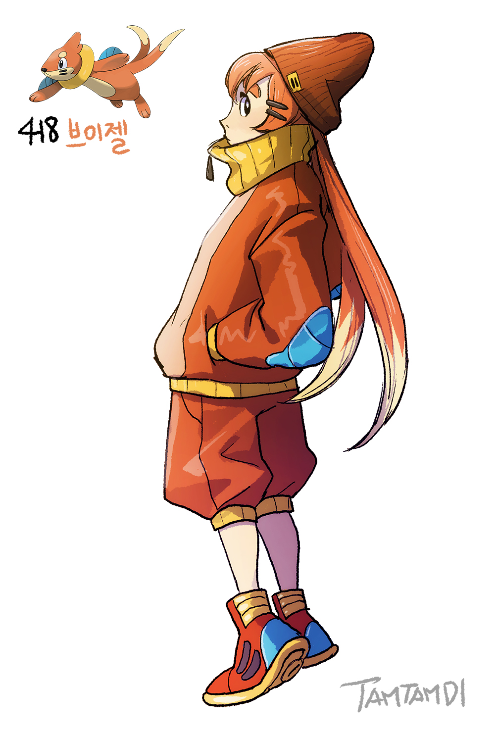 1girl beanie buizel gen_4_pokemon hair_ornament hairclip hands_in_pockets hat highres humanization jacket long_hair long_sleeves looking_at_viewer nintendo official_art_inset orange_jacket orange_shoes orange_shorts pokemon reference_inset shoes shorts signature simple_background tamtamdi translated white_background