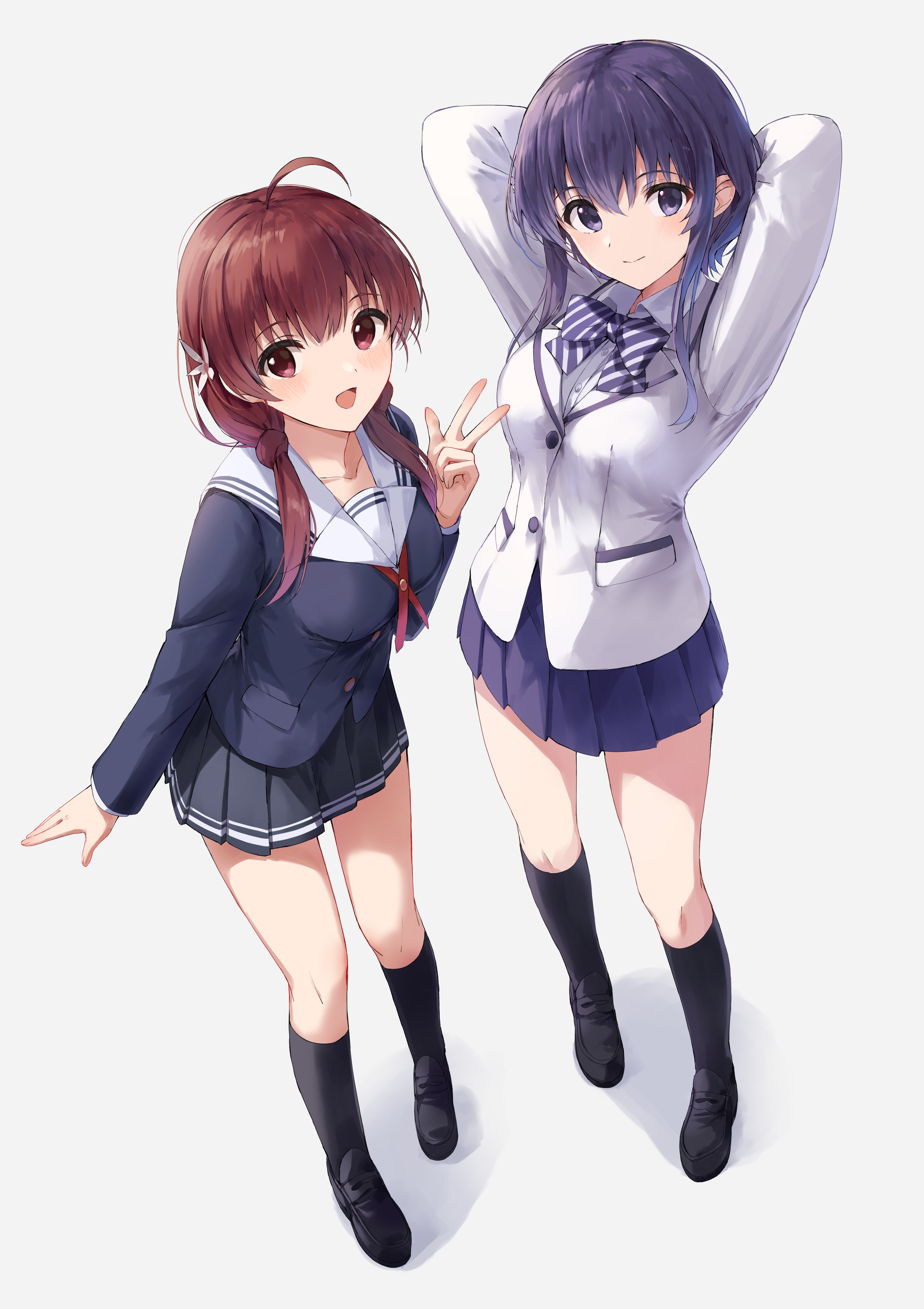 2girls absurdres arms_behind_head arms_up black_footwear black_skirt black_socks blazer blush bow bowtie breasts closed_mouth diagonal-striped_bow diagonal-striped_bowtie diagonal-striped_clothes flower hair_flower hair_ornament hashima_izumi highres hyoudou_michiru jacket kneehighs loafers long_hair long_sleeves looking_at_viewer multiple_girls neckerchief purple_bow purple_bowtie purple_eyes purple_hair purple_skirt red_eyes red_hair red_neckerchief saenai_heroine_no_sodatekata sailor_collar school_uniform serafuku shoes short_hair skirt smile socks standing striped_bow striped_bowtie striped_clothes twintails v white_jacket white_sailor_collar yanagi_marie