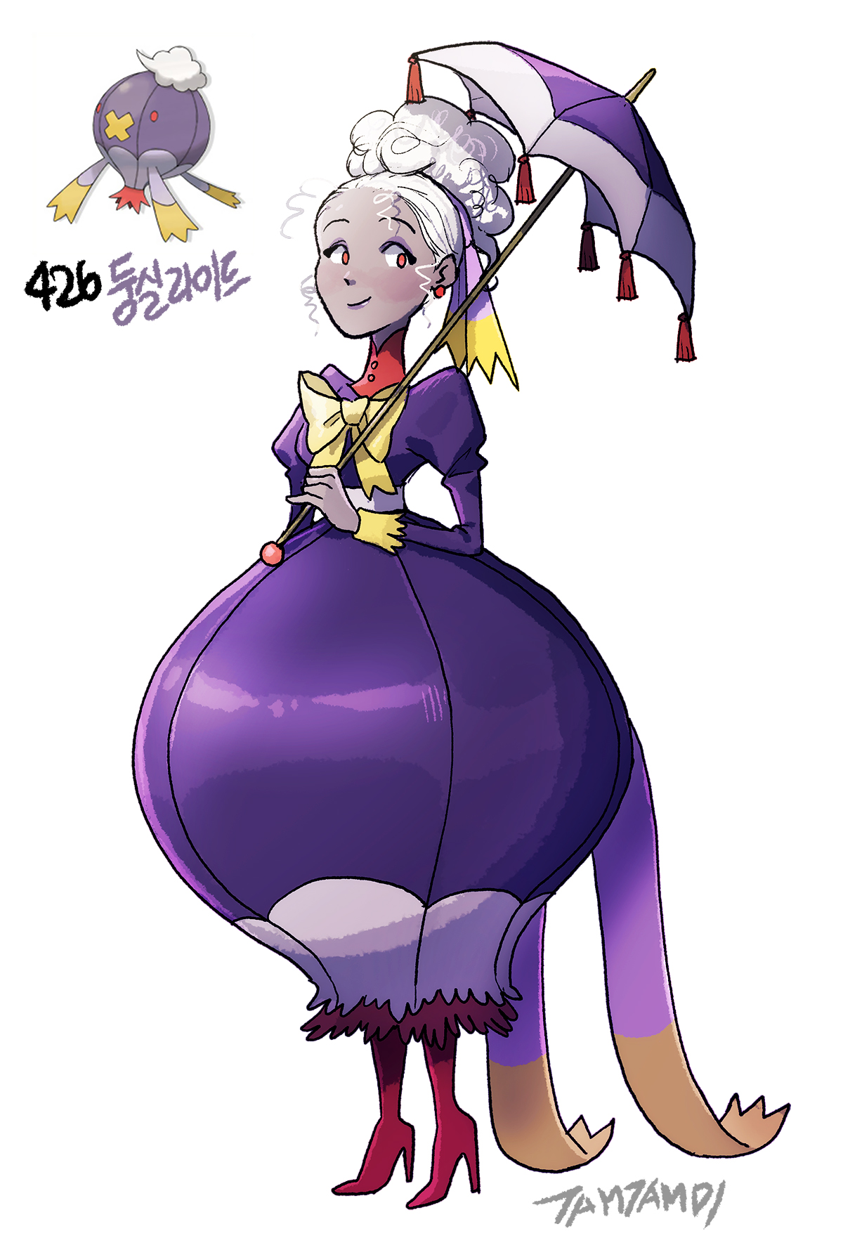 1girl bow closed_mouth commentary_request dress drifblim earrings full_body gen_4_pokemon highres holding holding_umbrella jewelry juliet_sleeves long_sleeves looking_at_viewer nintendo official_art_inset parasol personification pokemon pokemon_(creature) ponytail puffy_sleeves purple_dress red_eyes reference_inset signature simple_background smile tamtamdi translated umbrella white_background white_hair yellow_bow