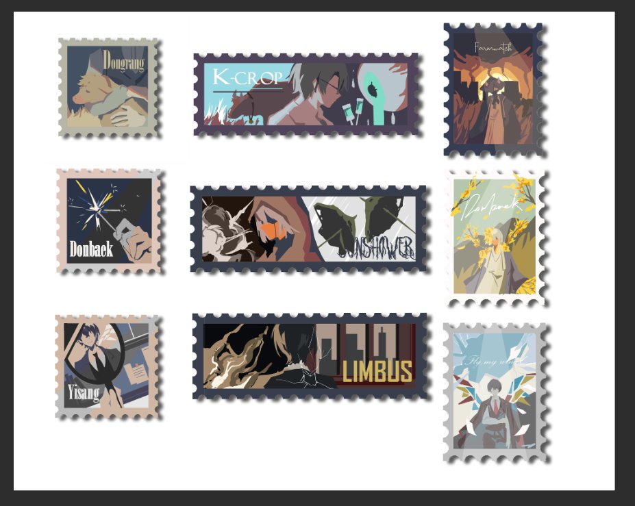 1girl 2boys baby_animal brown_cloak calf_(animal) cloak dongbaek_(project_moon) dongrang_(project_moon) e.g.o_(project_moon) farmwatch_(e.g.o) fireworks hanbok holding holding_fireworks holding_mirror korean_clothes limbus_company mirror multiple_boys postage_stamp project_moon shirt short_hair simple_background sixgod sparkler spicebush_(e.g.o) syringe the_tearful_thing_(project_moon) umbrella white_hair white_shirt yi_sang_(project_moon)