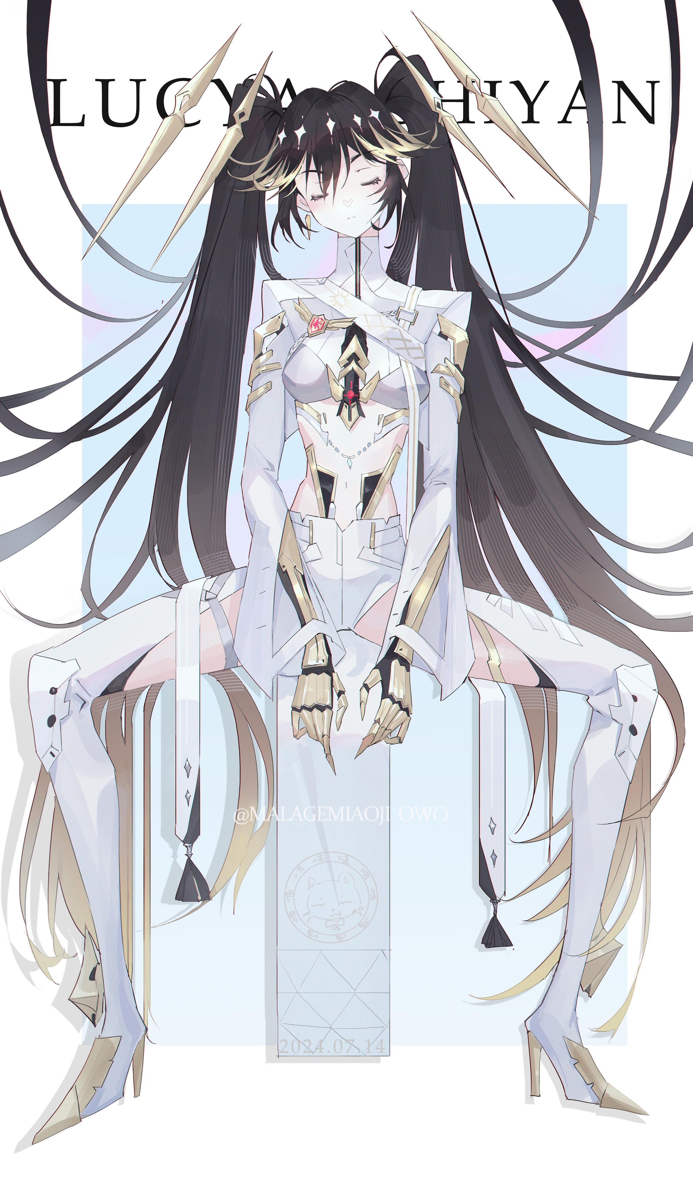 1girl absurdly_long_hair absurdres black_hair blonde_hair character_name closed_eyes clothing_cutout earrings floating_headgear high_heels highres hongyi_chen jacket jewelry leggings long_hair lucia:_pyroath_(pgr) lucia_(pgr) mechabare mechanical_arms mechanical_hands midriff multicolored_hair navel punishing:_gray_raven solo streaked_hair thigh_cutout twintails twitter_username very_long_hair watermark white_jacket white_leggings