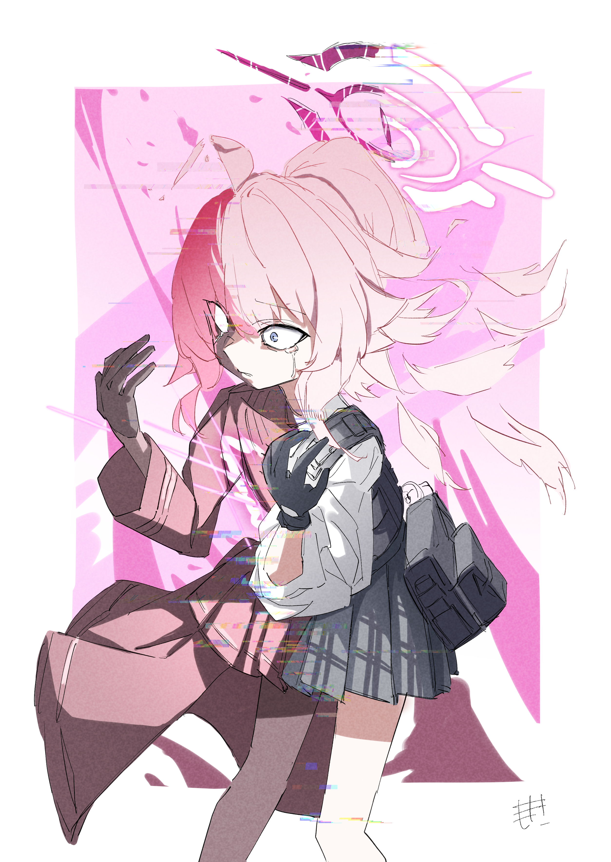 1girl absurdres ahoge bag blue_archive broken_halo crying hair_between_eyes halo highres hoshino_(blue_archive) hoshino_terror_(blue_archive) long_sleeves pink_hair plaid_clothes plaid_skirt pleated_skirt skirt spoilers streaming_tears takinohamira tears