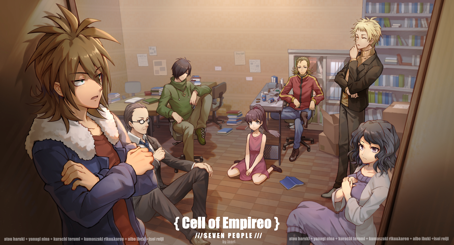 2girls 5boys aiba_ibuki atou_haruki black_hair black_jacket black_pants black_pantyhose blonde_hair blue_jacket blue_necktie blue_pants box breasts brown_hair brown_pants brown_sweater cardboard_box chair character_name checkered_floor closed_eyes closed_mouth collared_shirt commentary_request copyright_name crossed_arms desk dress english_text fur-trimmed_jacket fur_trim glasses green_eyes green_jacket green_shoes grey_jacket grey_shoes hair_between_eyes hair_over_one_eye highres impact_(font) in-universe_location inari_(rabbit292) indoors isoi_reiji jacket kumazaki_karen kumazaki_riku kurachi_terumi long_hair long_sleeves medium_breasts medium_hair multiple_boys multiple_girls necktie on_chair open_clothes open_jacket open_mouth pants pantyhose ponytail purple_dress purple_eyes red_dress red_jacket red_shirt ribbed_sweater saibou_shinkyoku sanpaku shirt shoes short_hair sitting sleeveless sleeveless_dress standing sweater sweater_dress turtleneck turtleneck_sweater wariza white_background yanagi_nina
