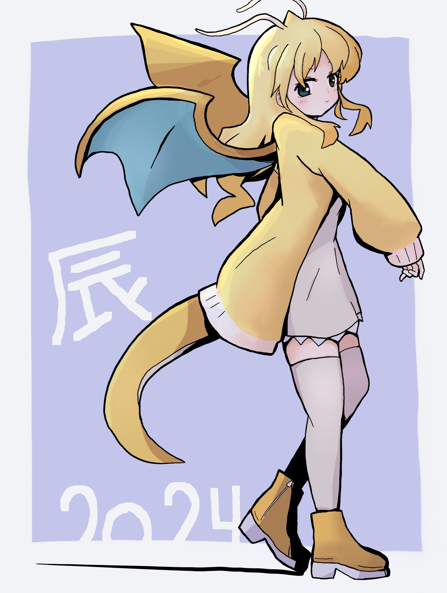 1girl antennae blonde_hair chinese_zodiac closed_mouth dated dragon_girl dragon_tail dragon_wings dragonite gen_1_pokemon highres long_hair namakura_g new_year nintendo personification pokemon pokemon_(creature) smile solo standing tail wings year_of_the_dragon
