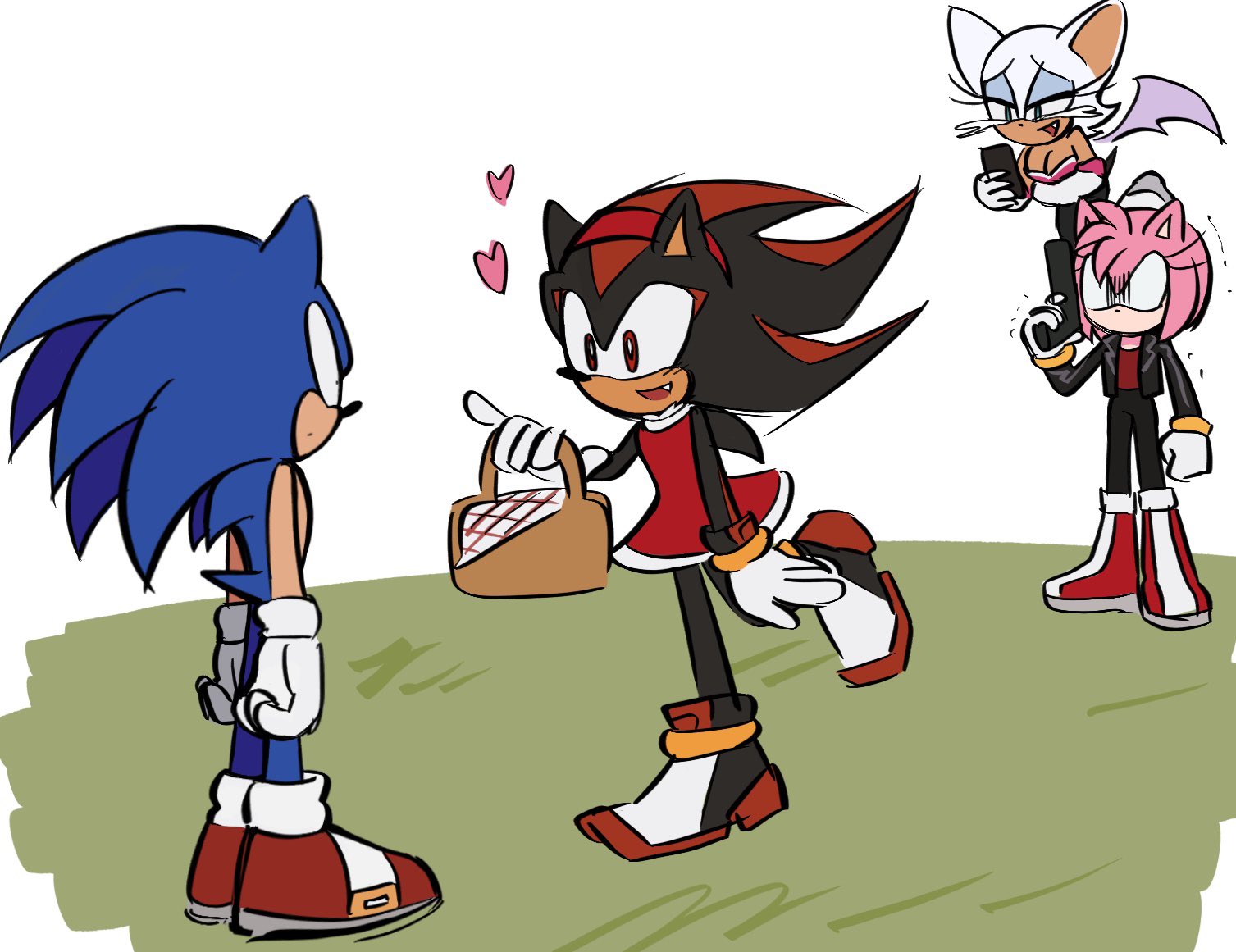 2boys 2girls amy_rose amy_rose_(cosplay) angry animal_ears animal_nose basket bat_girl bat_wings black_jacket boots breasts cleavage cosplay dress empty_eyes fang flying furry furry_female furry_male gloves green_eyes gun hairband handgun heart holding holding_basket holding_gun holding_phone holding_weapon jacket laughing looking_at_another multiple_boys multiple_girls open_mouth phone picnic_basket red_dress red_eyes red_footwear red_hairband rodka_sth rouge_the_bat shaded_face shadow_the_hedgehog shadow_the_hedgehog_(cosplay) shoes simple_background smile sonic_(series) sonic_the_hedgehog standing tail tears trembling weapon white_background white_gloves wings