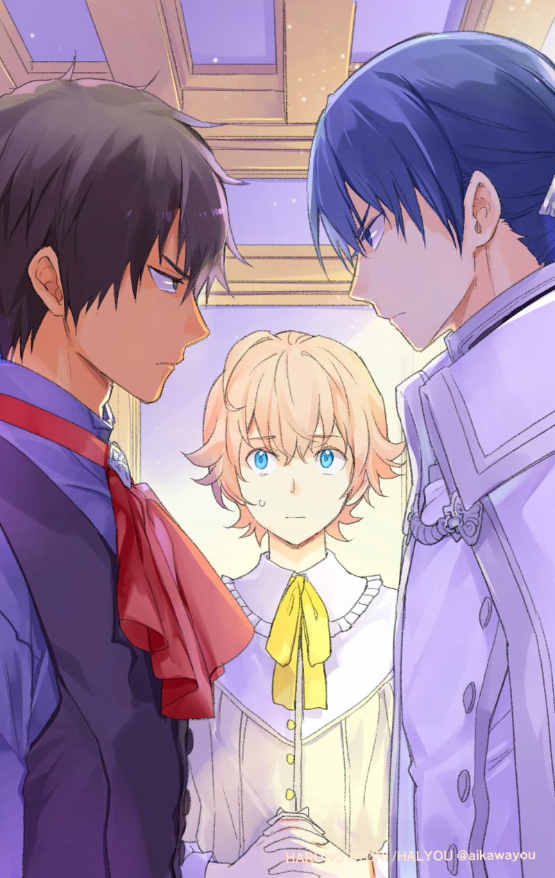 3boys artist_name ascot black_vest blonde_hair blue_eyes blue_hair brown_hair eye_contact hair_between_eyes halyou highres indoors looking_at_another multiple_boys own_hands_together red_ascot ribbon seven_princes_of_the_millennium_labyrinth standing sweatdrop vest yellow_ribbon