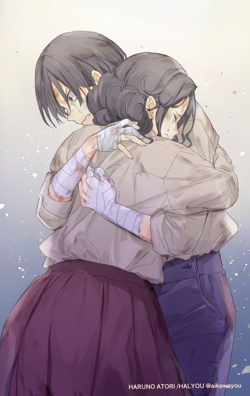 1boy 1girl arm_wrap artist_name brown_hair brown_skirt crying crying_with_eyes_open dirty dirty_face gradient_background halyou highres hug long_sleeves seven_princes_of_the_millennium_labyrinth short_hair skirt standing tears