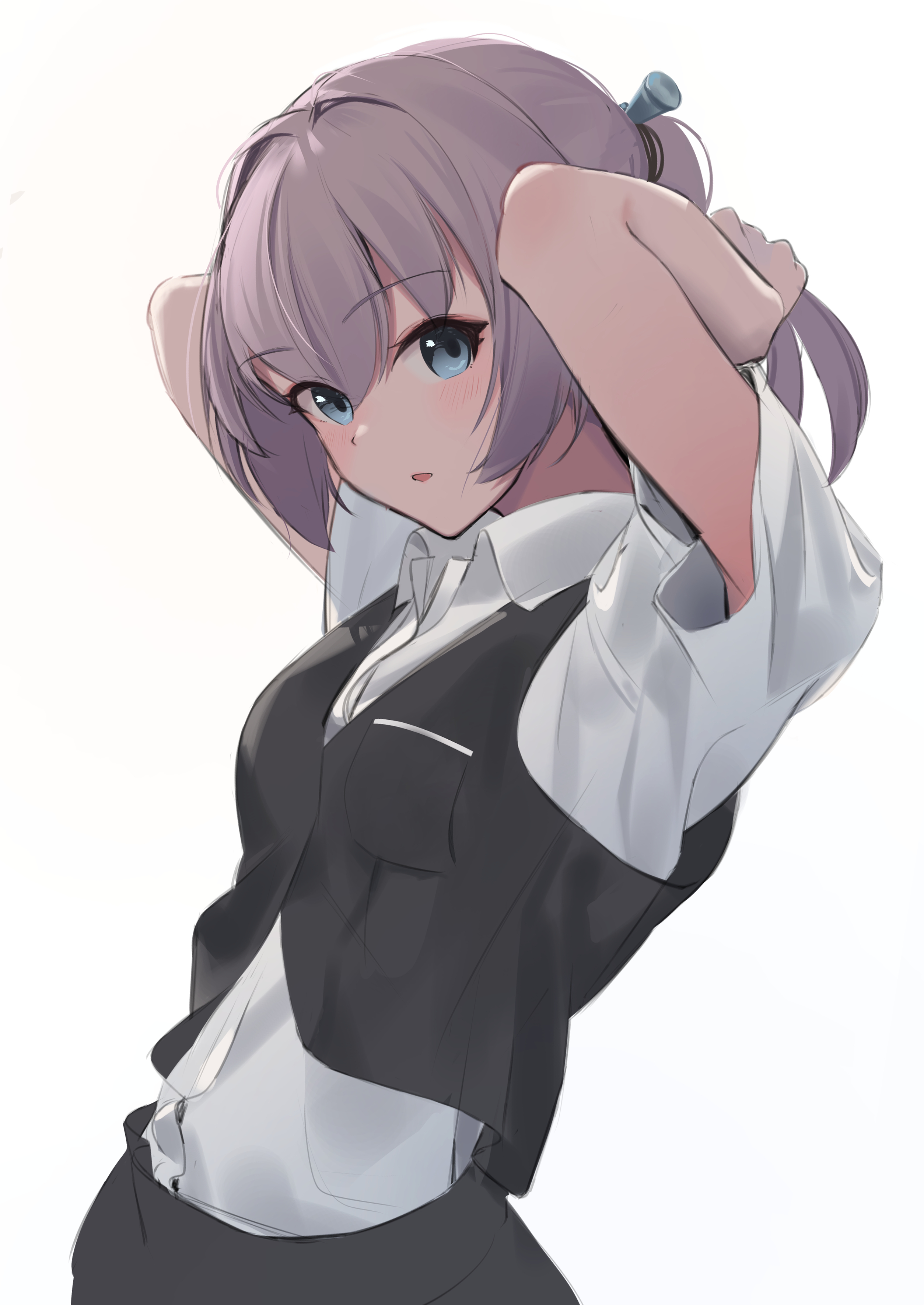 1girl absurdres arms_behind_head black_skirt black_vest blue_eyes collared_shirt cowboy_shot dress_shirt grey_hair highres holding holding_own_hair kantai_collection kokenashi shiranui_(kancolle) shirt simple_background skirt solo upper_body vest white_background white_shirt