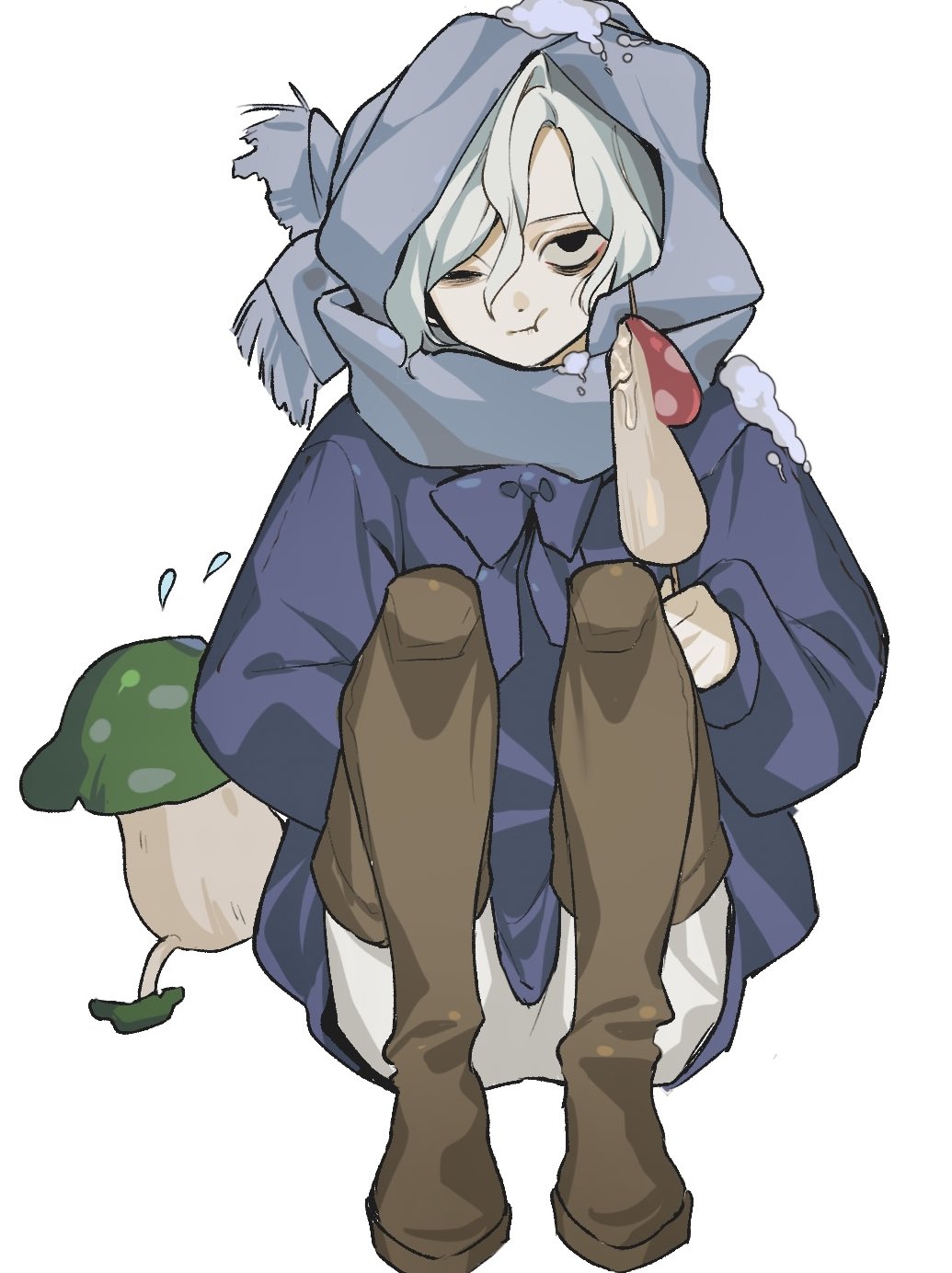 1boy :t bags_under_eyes behind_another black_eyes coat dungeon_meshi eating elf food full_body grey_hair hamita_(rikopin_ika) highres holding holding_food knees_up lazy_eye long_sleeves looking_at_viewer male_focus mithrun notched_ear pants pointy_ears scarf short_hair simple_background sitting snow_on_body snow_on_headwear solo sweatdrop tunic uneven_eyes walking_mushroom_(dungeon_meshi) wavy_hair white_background winter_clothes