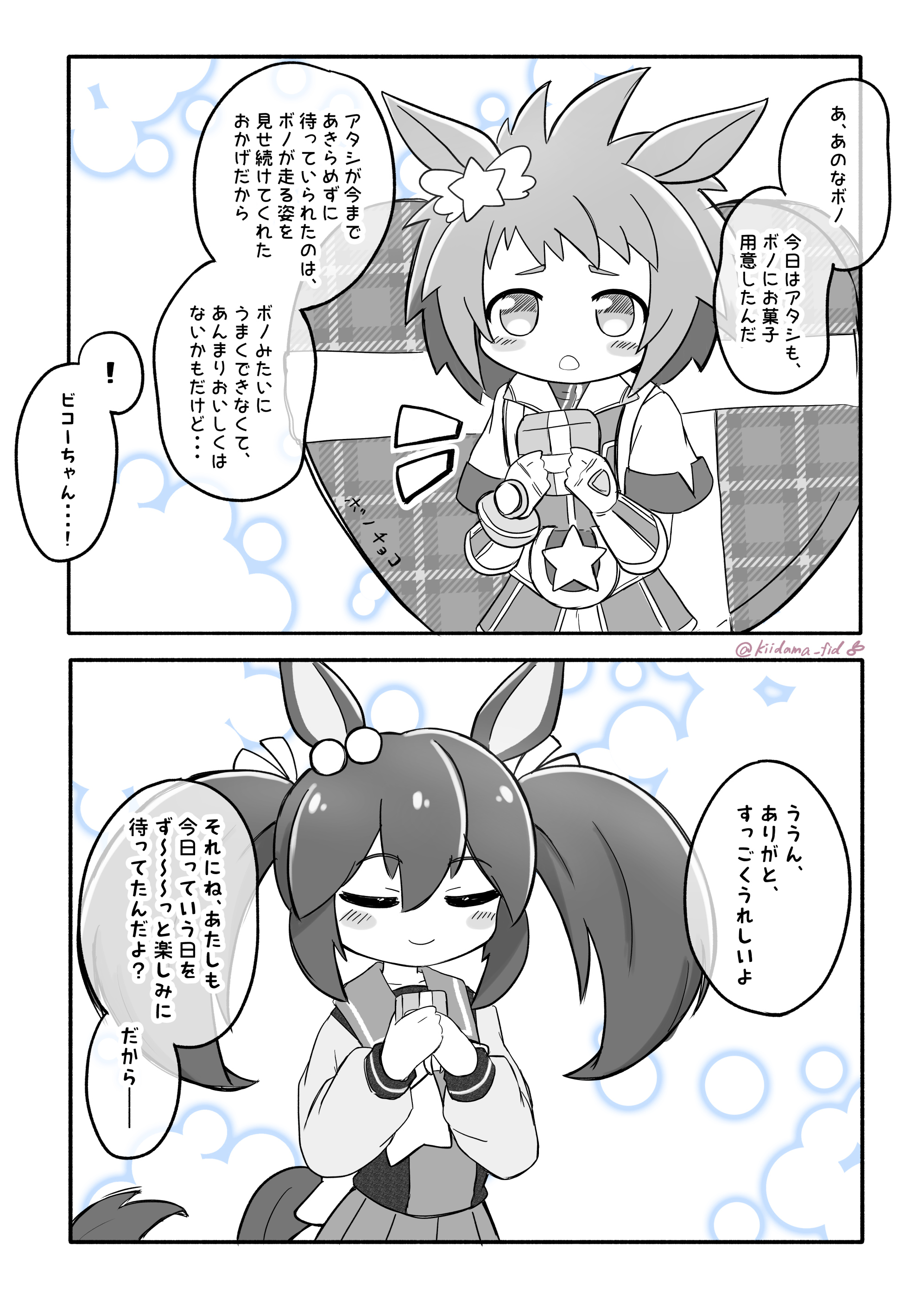 2girls absurdres animal_ears artist_name biko_pegasus_(umamusume) blush blush_stickers box closed_eyes ear_ornament gift happy heart-shaped_box highres hishi_akebono_(umamusume) holding holding_gift horse_ears horse_girl kiidama_fid multiple_girls short_hair translation_request twintails umamusume