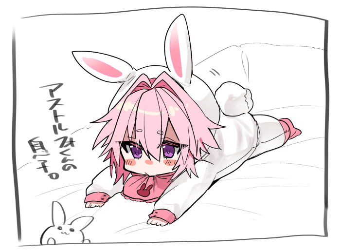 :3 aged_down animal_ears animal_hood astolfo_(fate) baby bib blush_stickers fate/apocrypha fate_(series) hair_between_eyes hair_intakes haoro hood jumpsuit lying on_stomach onesie pink_hair purple_eyes rabbit rabbit_ears rabbit_hood rabbit_tail short_eyebrows tail white_jumpsuit