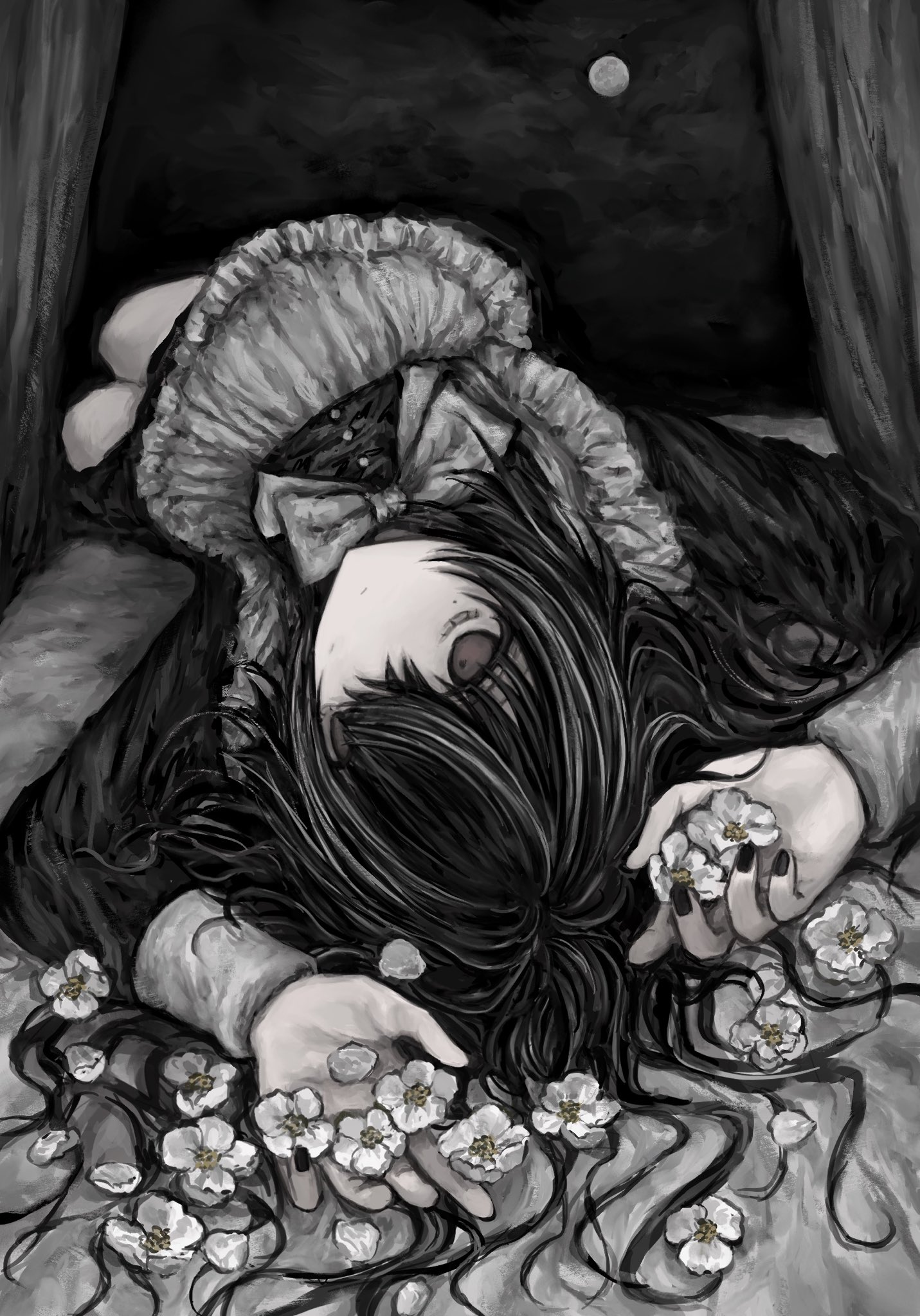 1girl apron black_dress black_hair brown_eyes chan8016 closed_mouth dress expressionless highres long_sleeves lying maid muted_color on_back original petals shirt solo upside-down waist_apron white_apron white_shirt wrist_cuffs