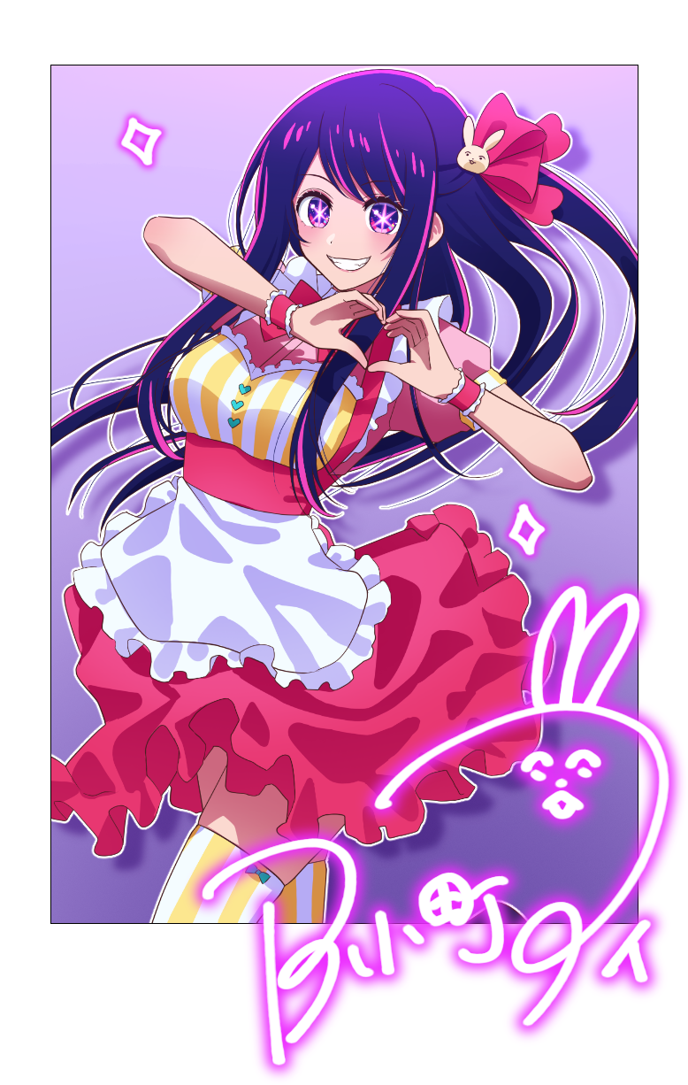 1girl blush breasts dress hair_between_eyes hair_ornament heart heart_hands highres hoshino_ai long_hair looking_at_viewer maid medium_breasts oshi_no_ko pink_dress purple_eyes purple_hair rabbit_hair_ornament smile solo star-shaped_pupils star_(symbol) striped_clothes striped_thighhighs symbol-shaped_pupils tachi-e tachibana_reiya teeth thighhighs