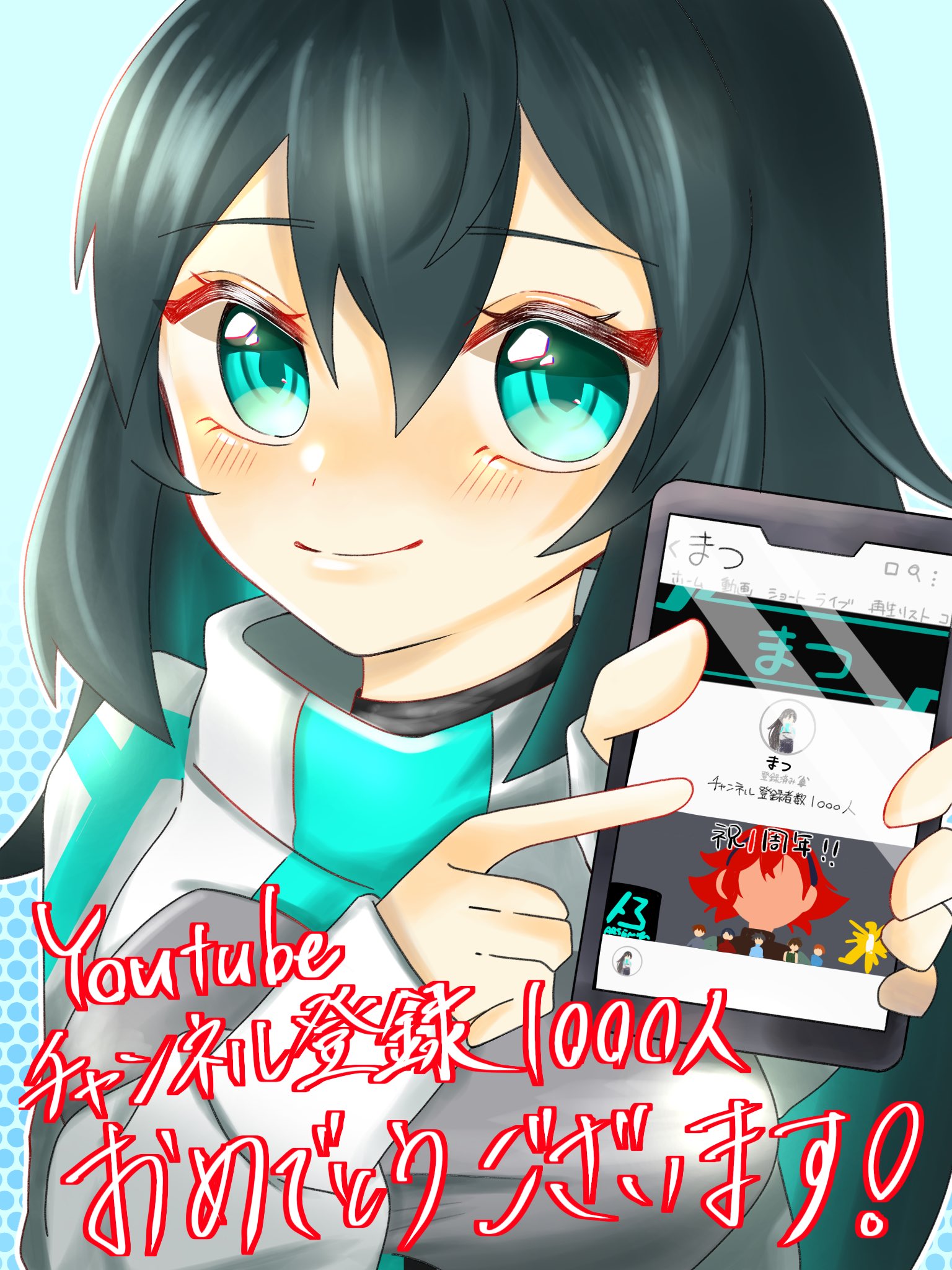 1girl amuro_ray aqua_eyes athrun_zala blue_background grey_shirt gundam gundam_00 gundam_arsenal_base gundam_build_divers gundam_build_divers_re:rise gundam_seed gundam_suisei_no_majo gundam_wing hair_between_eyes heero_yuy highres holding holding_phone juice_(jule_tyaojule) kira_yamato leaning_forward may_(gundam_build_divers_re:rise) milestone_celebration mobile_suit_gundam phone portrait setsuna_f._seiei shirt shrug_(clothing) smile solo suletta_mercury white_shrug youtube