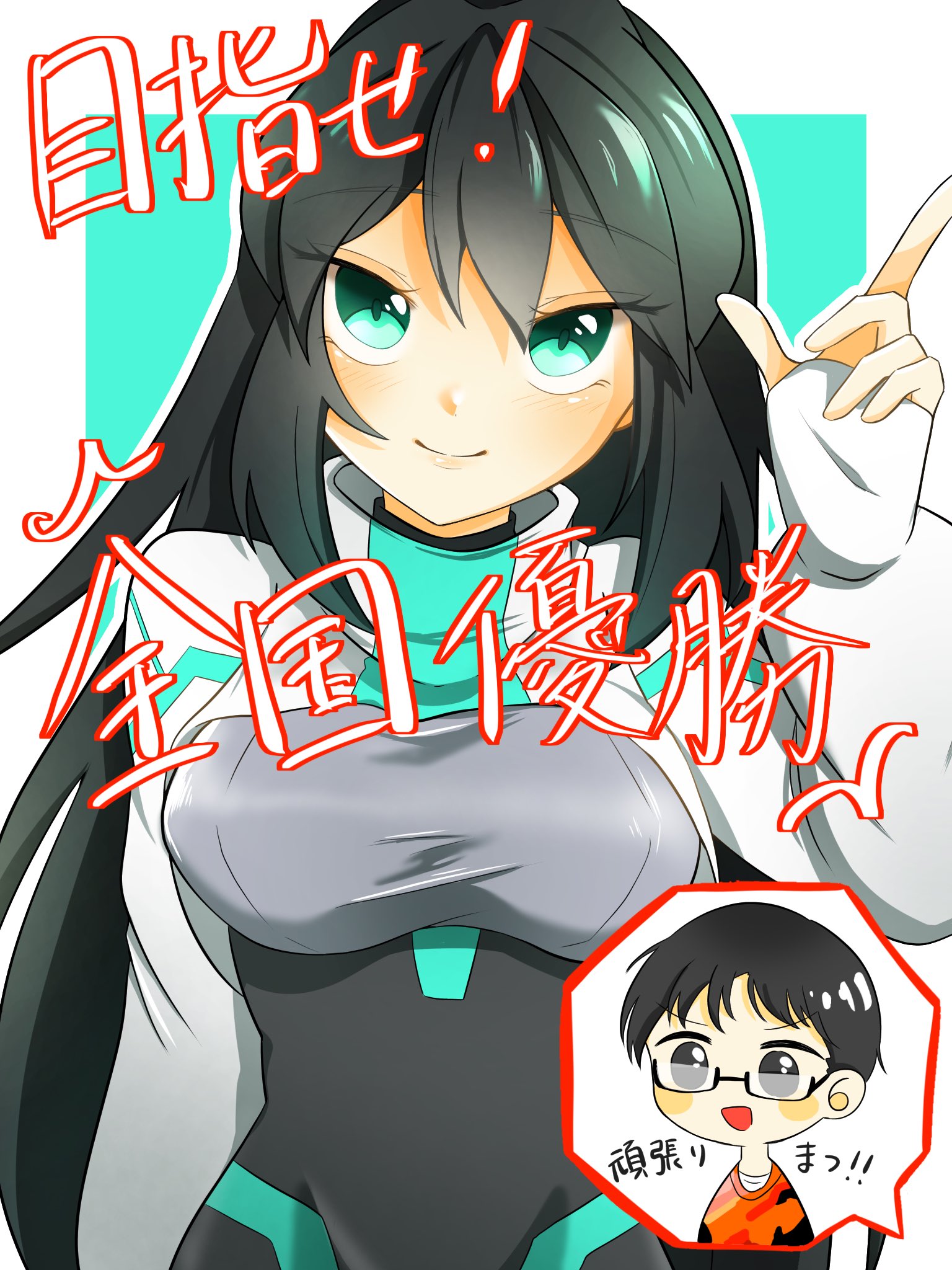 1boy 1girl aqua_background aqua_eyes artist_self-insert black_bodysuit black_eyes black_hair blush bodysuit border breasts gundam gundam_build_divers gundam_build_divers_re:rise highres juice_(jule_tyaojule) long_sleeves looking_at_viewer may_(gundam_build_divers_re:rise) medium_breasts outside_border shrug_(clothing) sleeves_past_wrists smile solo_focus speech_bubble upper_body v-shaped_eyebrows white_border white_shrug