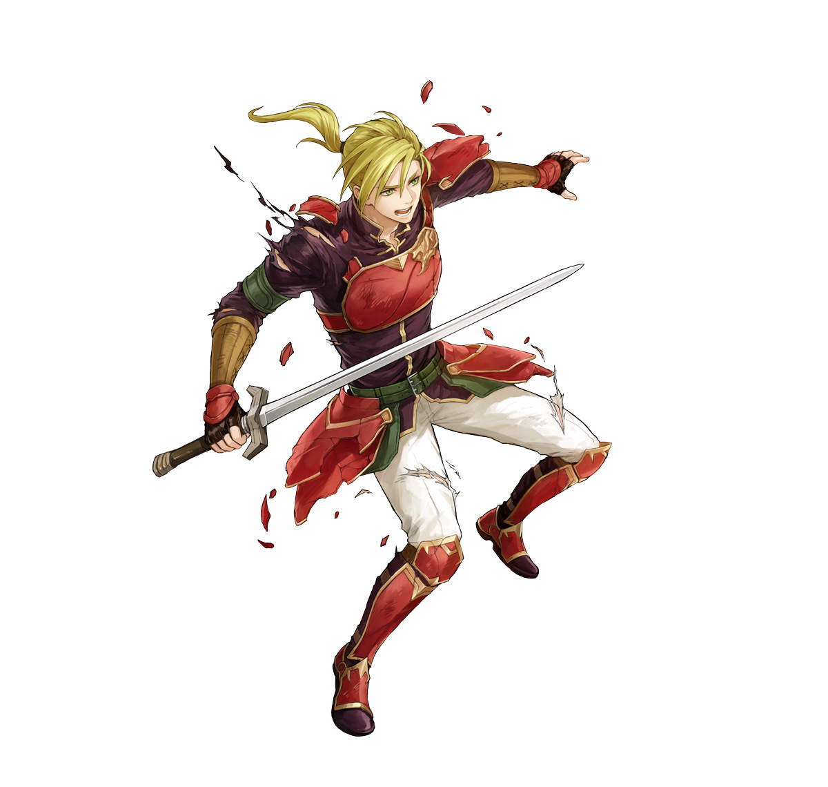 1boy armor blonde_hair fingerless_gloves fire_emblem fire_emblem:_the_sacred_stones fire_emblem_heroes forde_(fire_emblem) full_body gloves holding holding_sword holding_weapon nintendo official_art open_mouth pants pauldrons ponytail red_armor red_footwear short_hair shoulder_armor single_pauldron sword torn_clothes uroko_(mnr) weapon white_pants
