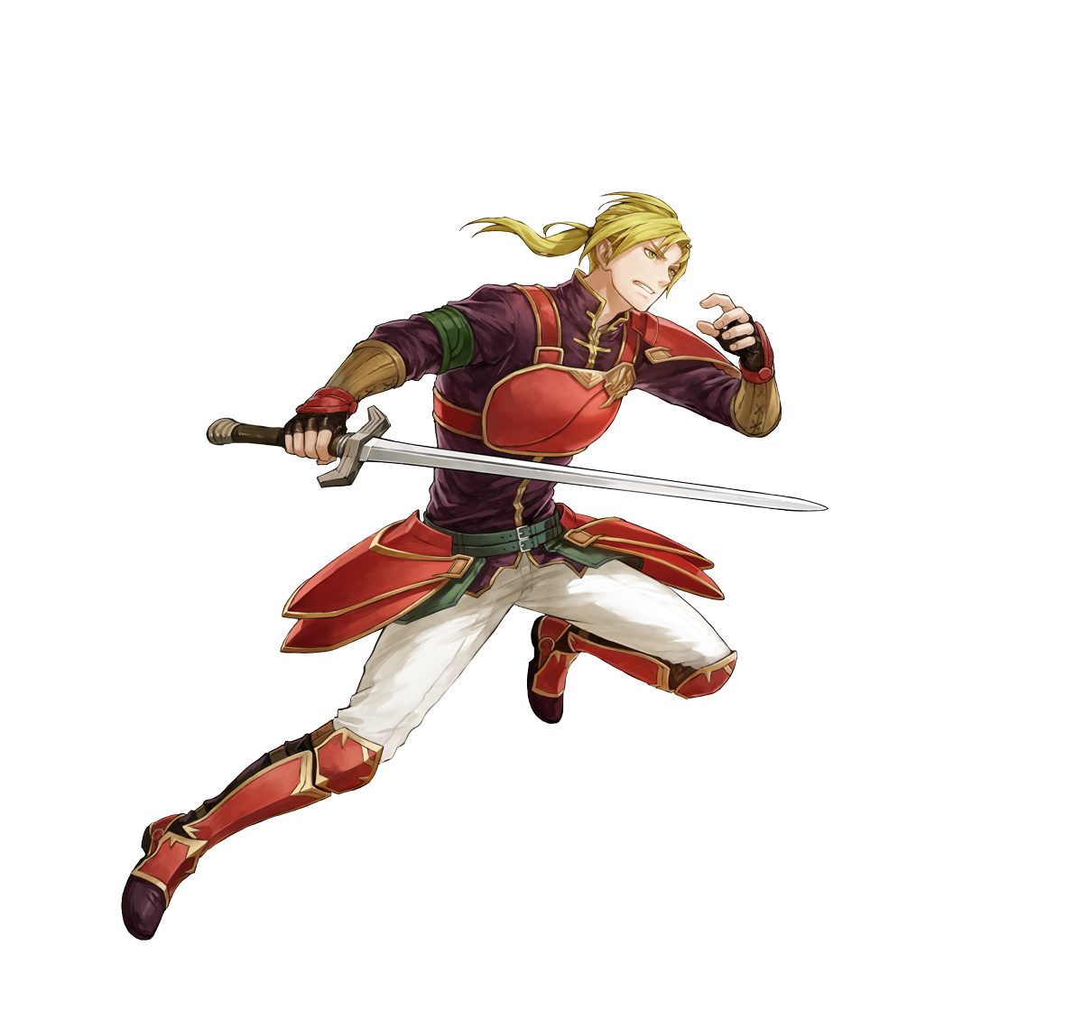 1boy arm_up armor blonde_hair clenched_teeth fingerless_gloves fire_emblem fire_emblem:_the_sacred_stones fire_emblem_heroes forde_(fire_emblem) full_body gloves holding holding_sword holding_weapon nintendo official_art pants pauldrons ponytail red_armor red_footwear short_hair shoulder_armor single_pauldron sword teeth uroko_(mnr) weapon white_pants