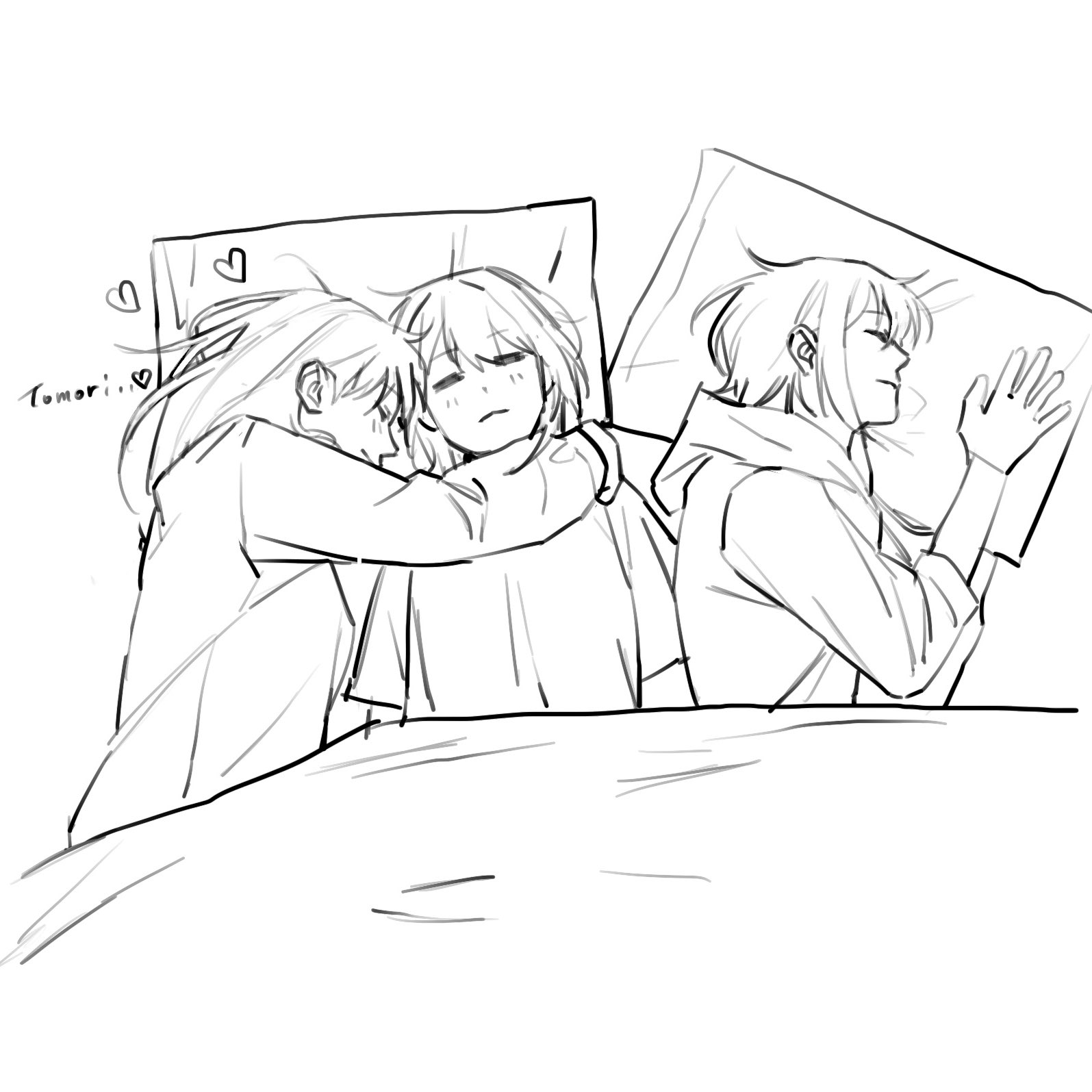 3girls =_= bang_dream! bang_dream!_it's_mygo!!!!! blush closed_eyes closed_mouth commentary greyscale hashtag-only_commentary highres hood hood_down hoodie hug kaname_raana long_sleeves monochrome multiple_girls nohee07 shiina_taki sketch takamatsu_tomori under_covers yuri