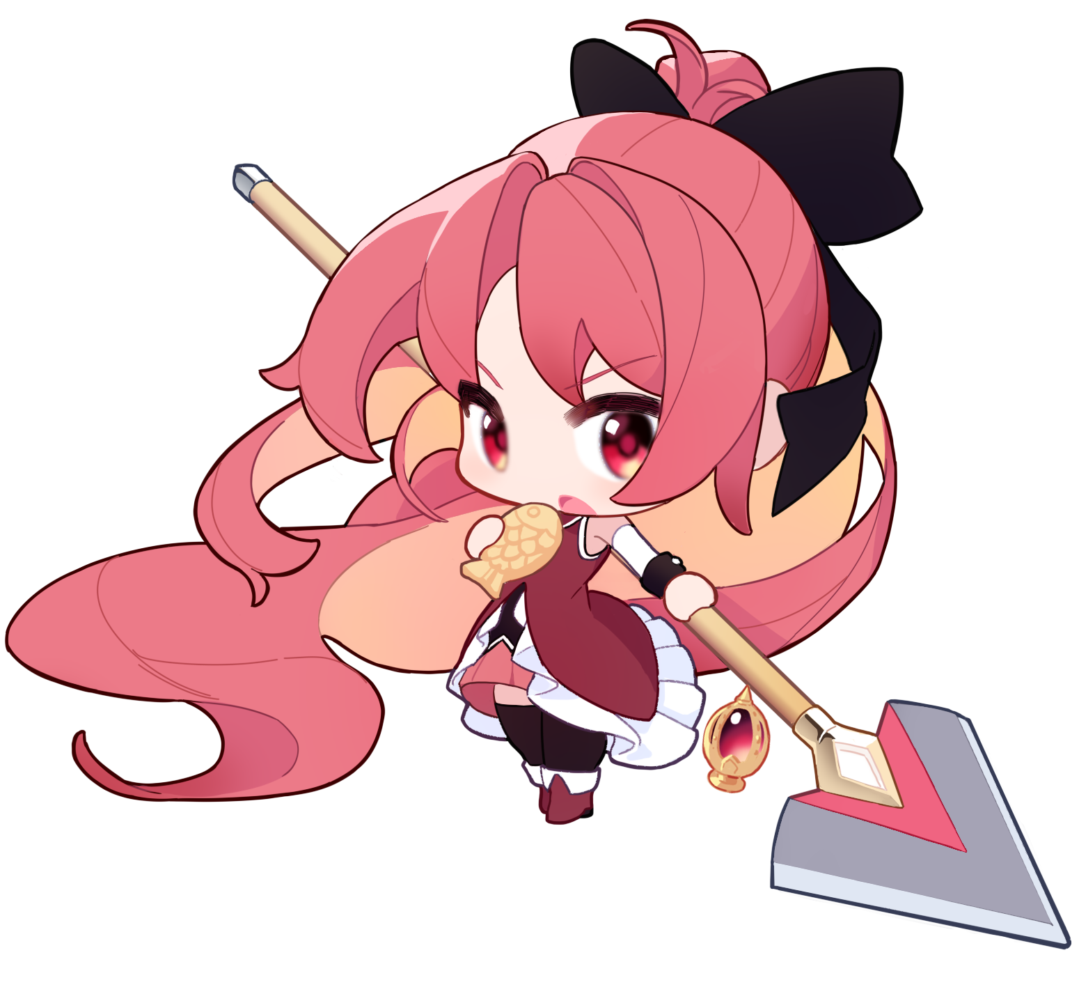 1girl antenna_hair bare_shoulders black_bow black_shirt black_thighhighs black_wrist_cuffs boots bow buttons chibi colored_inner_hair commentary detached_sleeves dress eating floating_hair food frilled_dress frills hair_bow hentai-faith high_heel_boots high_heels highres holding holding_behind_back holding_food holding_polearm holding_weapon holding_weapon_behind_back long_dress long_hair long_sleeves magical_girl mahou_shoujo_madoka_magica mahou_shoujo_madoka_magica_(anime) miniskirt multicolored_hair open_mouth orange_hair pleated_skirt polearm ponytail red_boots red_dress red_eyes red_hair red_skirt sakura_kyoko sakura_kyoko_(magical_girl) shirt skirt skirt_under_dress sleeveless sleeveless_dress sleeveless_shirt solo soul_gem spear taiyaki thighhighs transparent_background v-shaped_eyebrows very_long_hair wagashi weapon white_sleeves wrist_cuffs