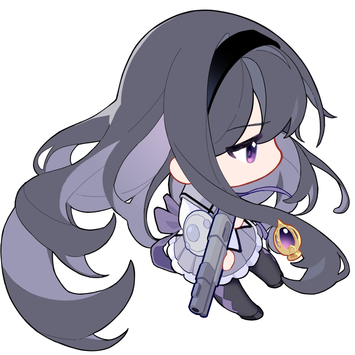 1girl akemi_homura akemi_homura_(magical_girl) argyle_clothes argyle_pantyhose back_bow black_hair black_hairband black_pantyhose black_shoes bow capelet chibi colored_inner_hair commentary diamond_in_eye dress frilled_skirt frills from_side grey_hair gun hairband hentai-faith holding holding_gun holding_weapon long_hair long_sleeves magical_girl mahou_shoujo_madoka_magica mahou_shoujo_madoka_magica_(anime) miniskirt multicolored_hair neck_ribbon no_mouth pantyhose pleated_skirt purple_bow purple_capelet purple_eyes purple_ribbon purple_skirt ribbon rifle shield shoes short_dress skirt skirt_under_dress solo soul_gem transparent_background very_long_hair weapon white_dress