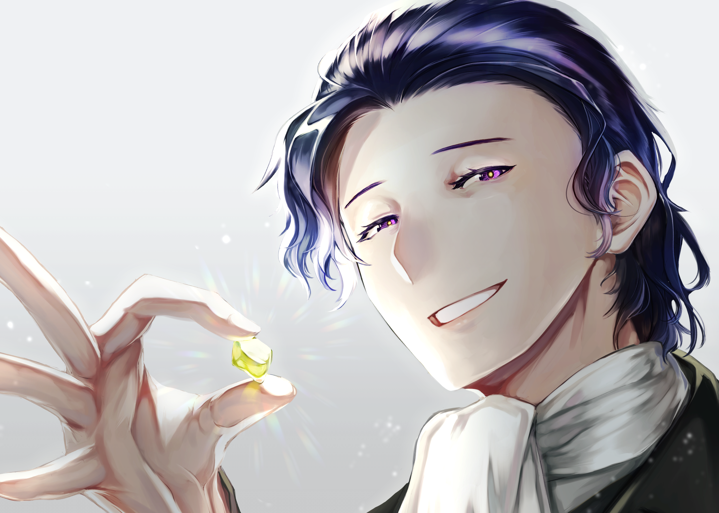 1girl ascot black_jacket blue_hair bright_pupils commentary_request dark_blue_hair gem grey_background hand_up highres holding holding_gem jacket kazuya_hatoko light_particles long_sleeves male_focus portrait purple_eyes saibou_shinkyoku short_hair smile solo utsugi_rangiri white_ascot yellow_pupils