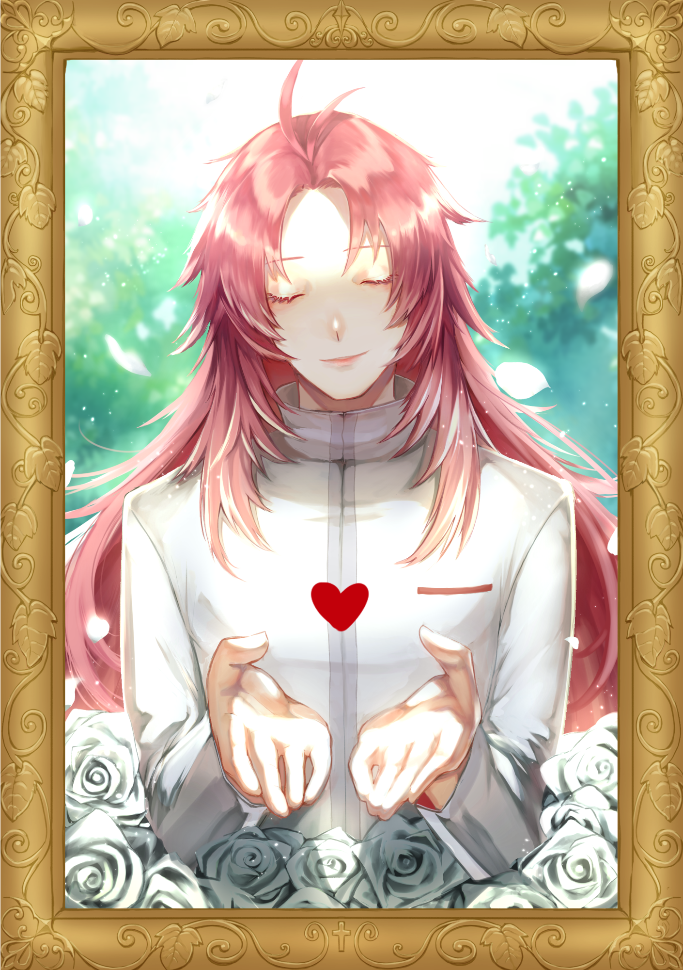 1boy border closed_eyes closed_mouth commentary_request cupping_hands facing_viewer flower hatsutori_hajime high_collar highres kazuya_hatoko light_particles long_hair long_sleeves male_focus outdoors own_hands_together parted_bangs petals pink_hair rose saibou_shinkyoku shirt smile solo upper_body white_flower white_rose white_shirt yellow_border