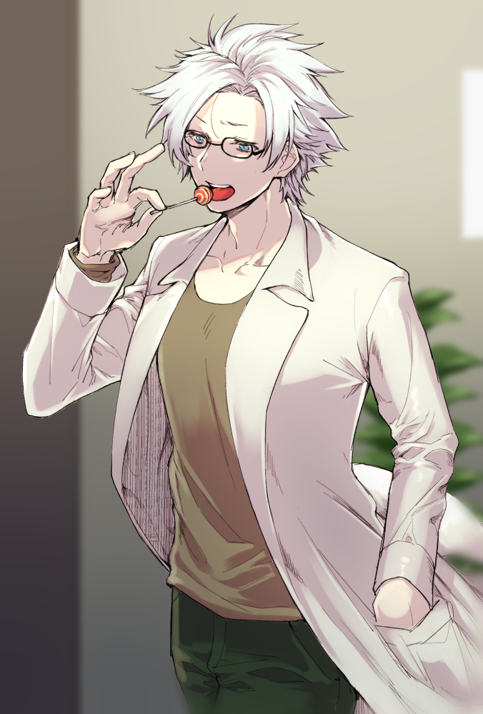 1boy blue_eyes blurry blurry_background brown_shirt candy commentary_request cowboy_shot food glasses green_pants hand_in_pocket holding holding_candy holding_food holding_lollipop indoors kanou_aogu kazuya_hatoko lab_coat lollipop long_sleeves male_focus open_clothes open_mouth pants saibou_shinkyoku shirt short_hair solo white_hair