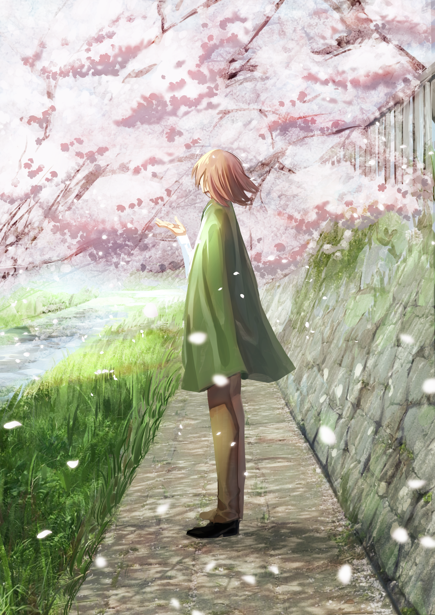 1boy black_shoes brown_hair brown_pants cherry_blossoms commentary_request day full_body grass green_jacket hand_up harada_mutei highres jacket kazuya_hatoko long_sleeves male_focus medium_hair outdoors pants petals saibou_shinkyoku shirt shoes solo standing white_shirt