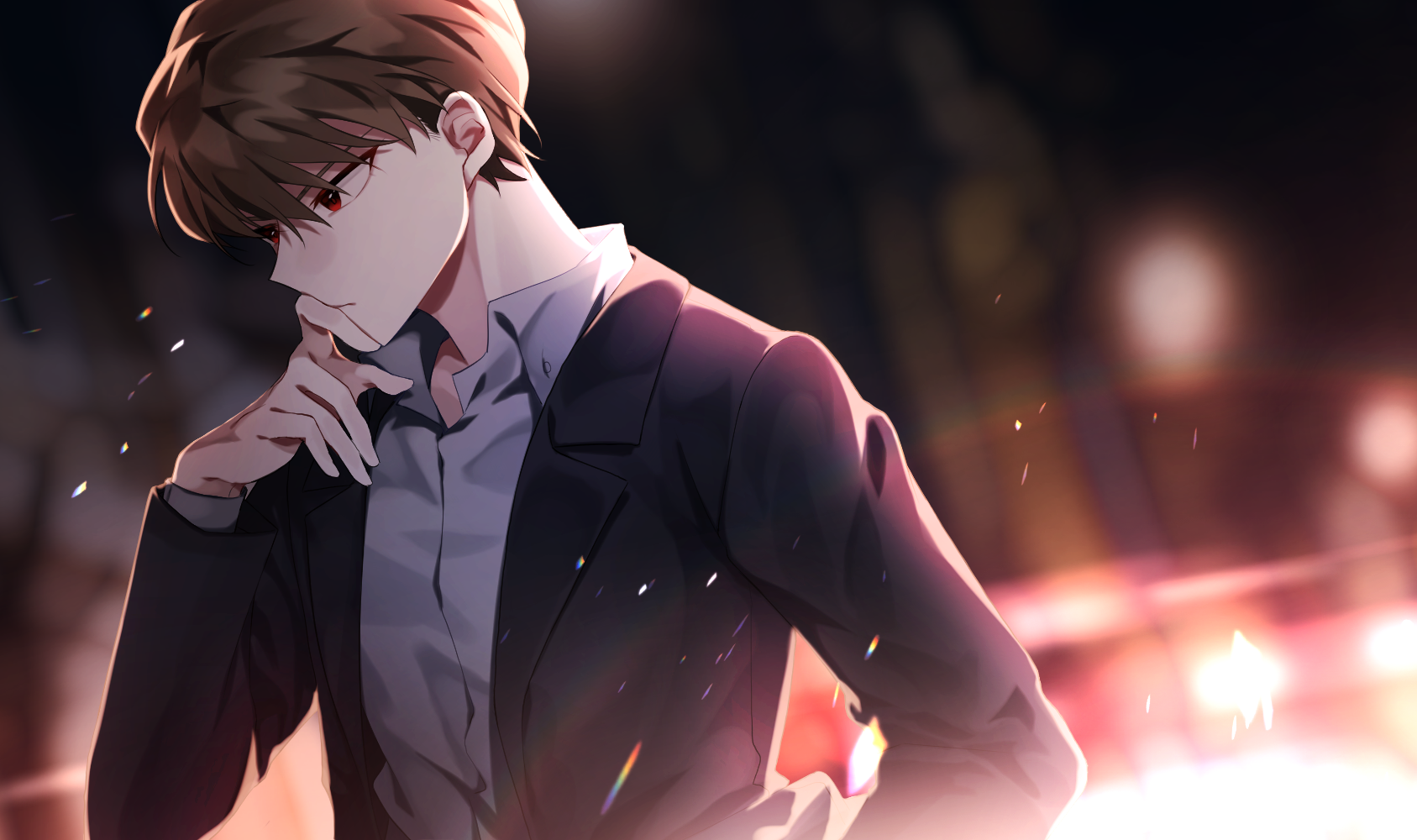 1boy bacon_(cnzxvy) black_jacket blazer blurry blurry_background commentary_request detective hakuba_saguru hand_on_own_chin highres jacket light_brown_hair light_particles long_sleeves looking_ahead looking_to_the_side magic_kaito male_focus red_eyes short_hair solo upper_body