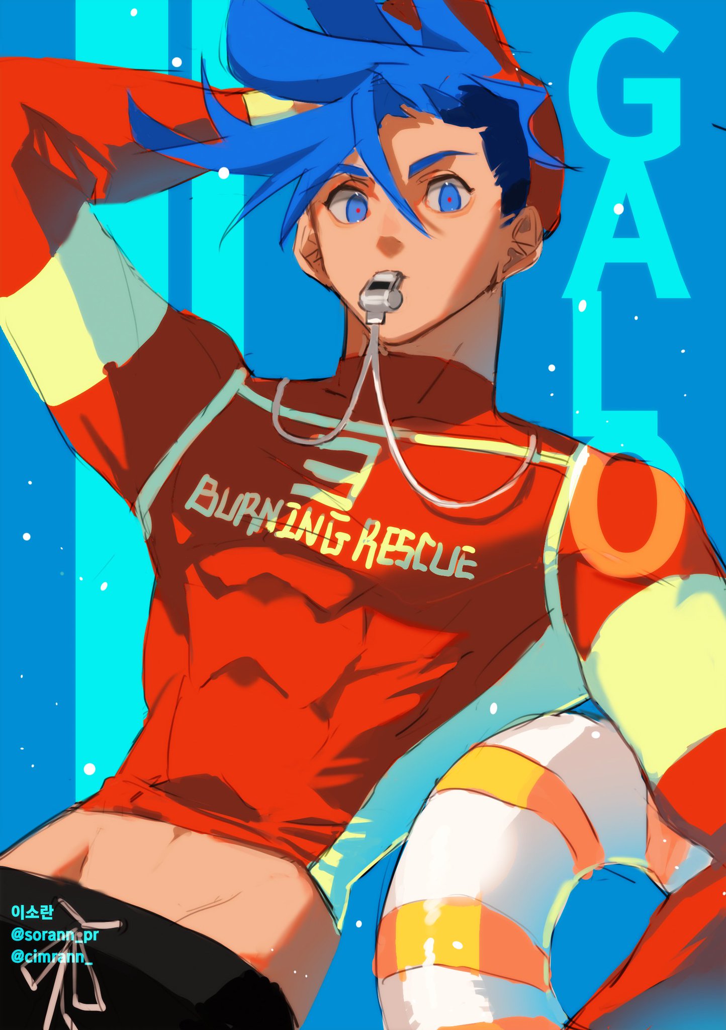 1boy abs arm_up baseball_cap black_pants blowing_whistle blue_background blue_eyes blue_hair character_name commentary compression_shirt drawstring dutch_angle galo_thymos groin hand_in_own_hair hat highres lifebuoy lifeguard long_sleeves looking_at_viewer male_focus midriff_peek mohawk pants pectorals promare red_hat red_shirt shirt shorts simple_background so-rann swim_ring twitter_username whistle