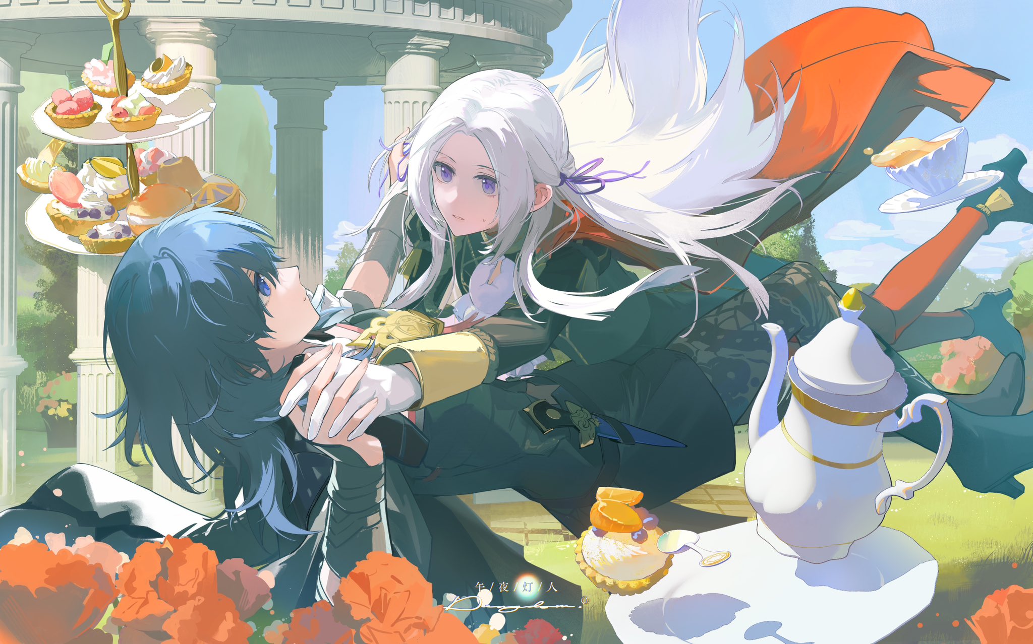 2girls amphitheater artuvia blue_eyes blue_hair blue_sky female_byleth_(fire_emblem) cape cloud column cup day dessert edelgard_von_hresvelg eye_contact falling fire_emblem fire_emblem:_three_houses flower food gloves grass highres holding_hands interlocked_fingers long_hair looking_at_another multiple_girls nintendo outdoors pillar plate purple_eyes shoes sky spoon tea teacup teapot white_hair yuri