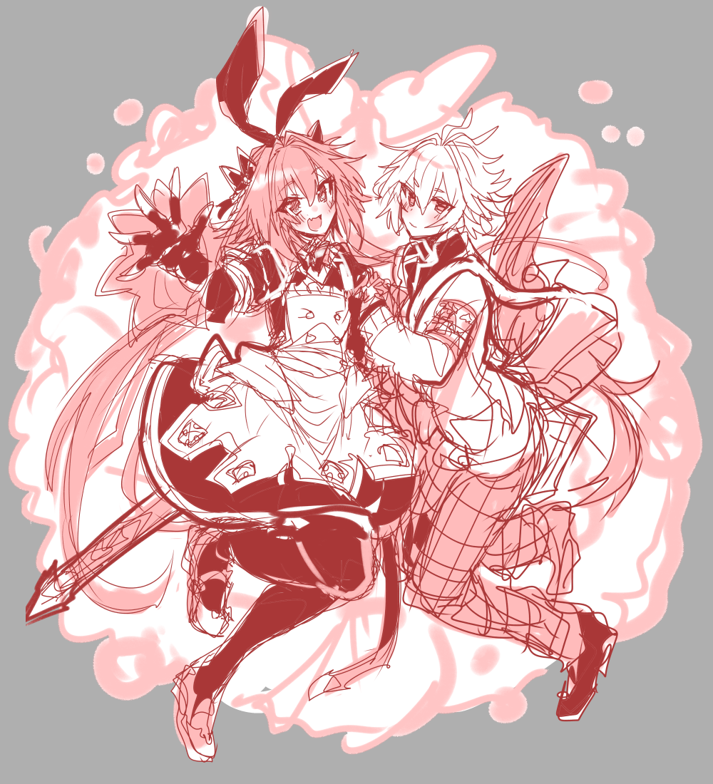 2boys animal_ears astolfo_(fate) astolfo_(saber)_(fate) astolfo_(saber)_(third_ascension)_(fate) black_bow black_footwear black_gloves black_shirt black_thighhighs blush bow closed_mouth crossdressing crossdressing_(mtf) dress fake_animal_ears fang fate/apocrypha fate/grand_order fate_(series) full_body gloves grey_background hair_between_eyes hair_bow hair_intakes haoro long_hair male_focus monochrome multiple_boys open_mouth pants pink_hair rabbit_ears ribbon shirt shoes short_eyebrows short_hair sieg_(deliverers_of_sentiment)_(fate) sieg_(fate) sketch skin_fang smile thighhighs trap twintails two-tone_dress very_long_hair white_hair wide_sleeves